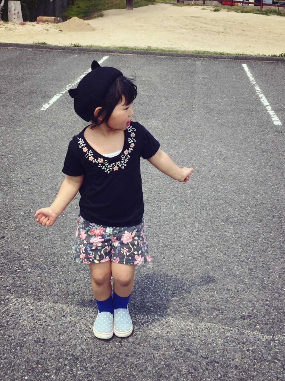 ショートパンツ:ノーブランド 刺しゅうTシャツとショートパンツ、 花柄のアイテムで揃えました。