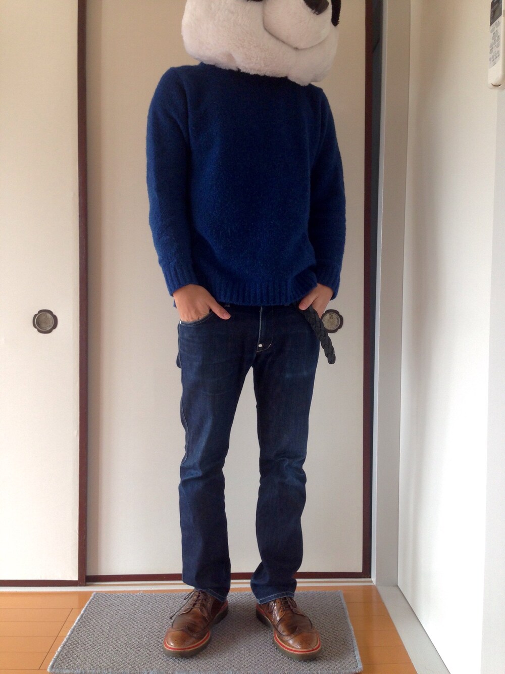 ブルーに1枚であったかコーデにしました。上を緩くした分下を細くは定番ですな。 ちょっとおっちゃんっぽいかな?