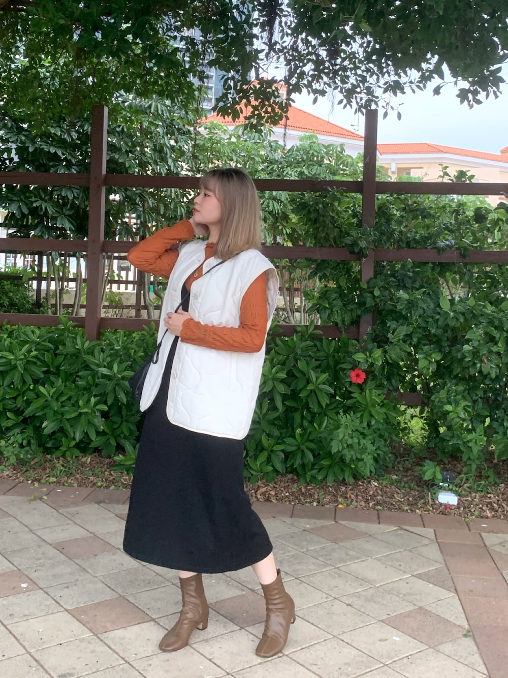 ホワイト系のジャケット/アウター、オレンジ系のトップス、ブラック系のワンピース/ドレスを着用したレディースの冬コーディネートの1枚目の写真