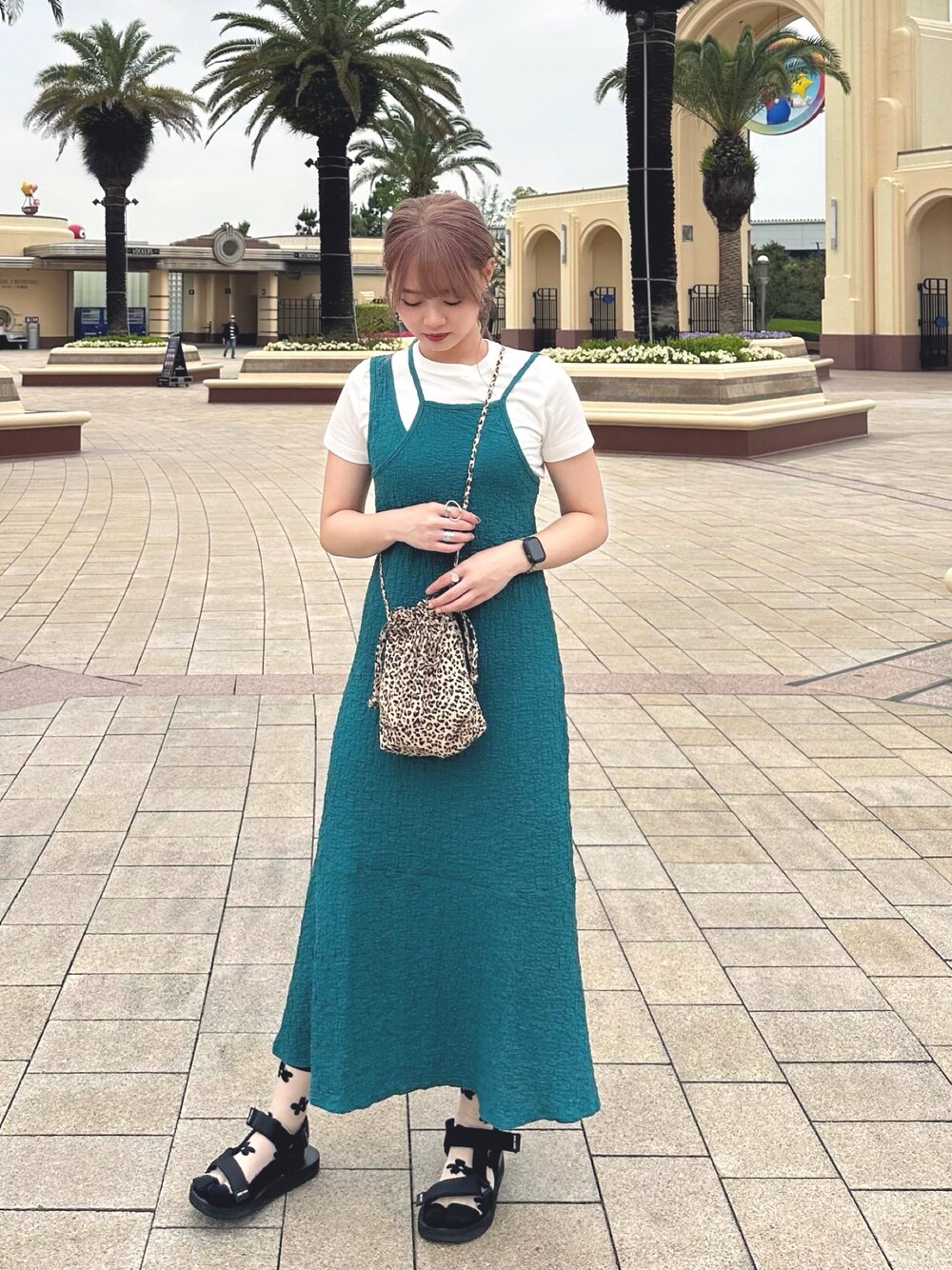 グリーン系のワンピースを着用したレディースの夏コーディネートの3枚目の写真