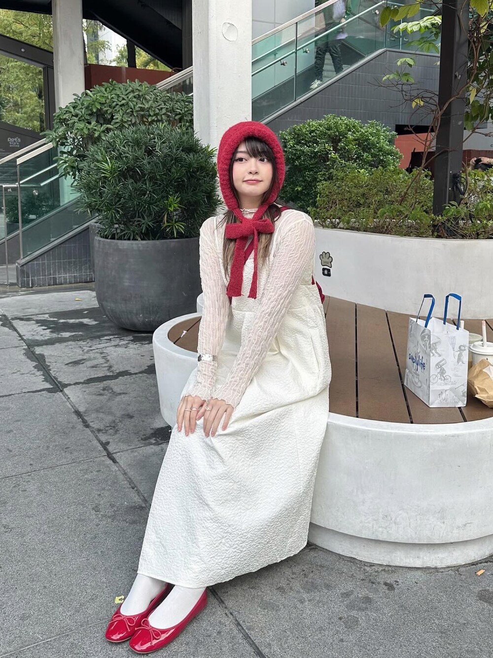ホワイト系のワンピースを着用したレディースの冬コーディネートの1枚目の写真