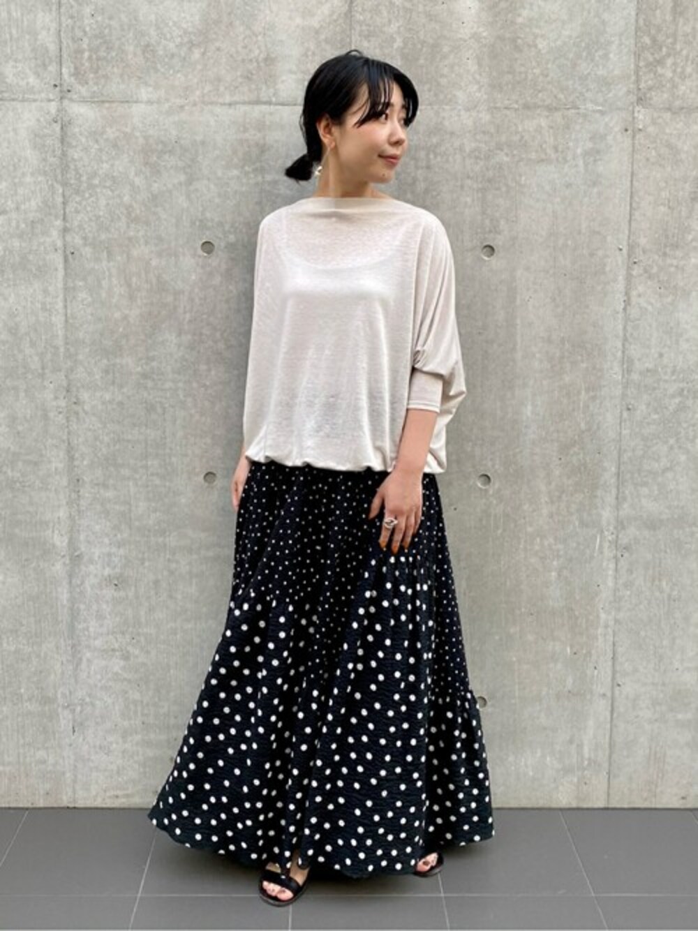 BEARDSLEY ビアズリー 2021.4.21 wed 12:00 GRAND OPEN 【スタッフレビュー】 大きさの違うドット生地を組み合わせたパッワークのロングスカート。 凹凸感のあるサッカー生地で夏も涼しく着られます。 【スカート】Fサイズ着用 ウエストゴム楽に履けるデザイン。 160cmの身長でくるぶしがかぶさる着丈です。 裏地はないですが、透け感もなしです。 生地は艶のないサッカー生地なので、普段使いしやすいカジュアルなスカートです。