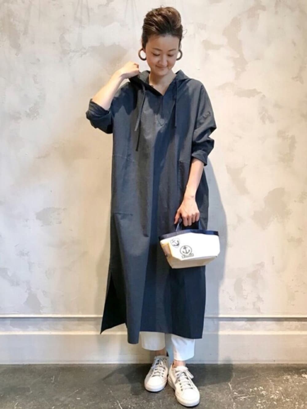 ランキング上位アイテムコーディネート(5月25日付) ワッペンミニトート ¥16,500税込 【スタッフレビュー】 透けなく楽に着られるワンピースはなにかと重宝するアイテム。 ボトムスに白のパンツで軽やかにしました。 【bag】 ワッペン付きのミニトート。 マチがあるので最低限の荷物を入れられます。 ワッペンがワンポイントになります。 【one-piece】着用サイズ:F 綿麻のフードワンピース。 生地感に少しハリがあるのでカジュアルすぎない。 私の身長ですねが隠れる長さですが、サイドに深めのスリットが入るのでスッキリみえます。 今入荷しているストールを羽織ったりしても、素敵ですね。 【pants】着用サイズ:1 トラックパンツは3サイズ展開の真ん中、1サイズを着用しています。 くるぶしが出るくらいの長さで、スッキリはけます。 カジュアルにもお仕事用にも使えるパンツです。