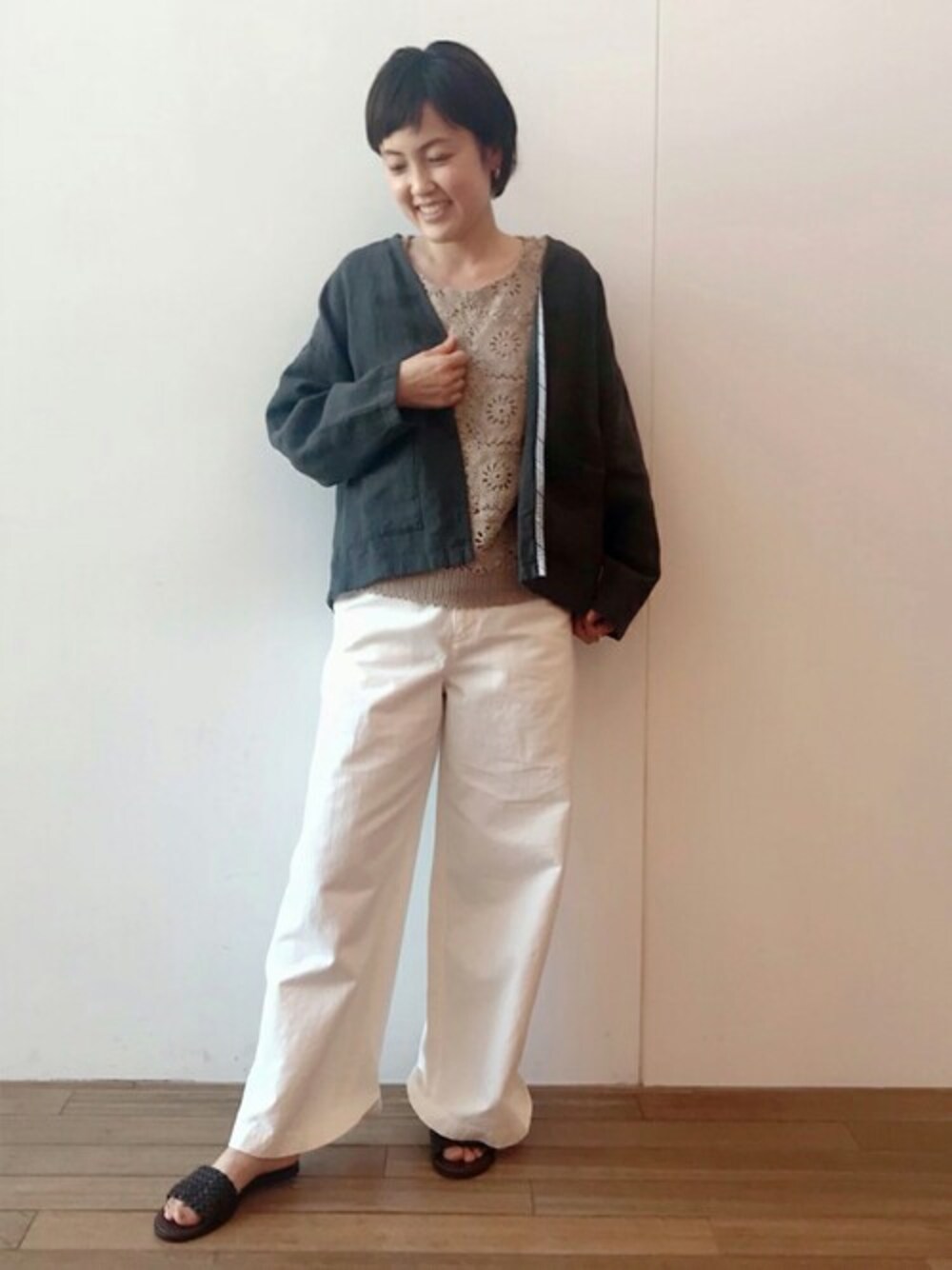 ランキング上位アイテムコーディネート(5月26日付) ヴィンテージレースタンク ¥22,000税込 【tops】着用サイズ:F フロント部分にヴィンテージレースをあしらったタンクトップ。 カットソー生地の上でレースを当てているので、レースの揺れる雰囲気が素敵です。 レース部分は全てアソートで一点一点大きさも異なります。 製品染めを施し、落ち着いた色味なのでボトムスを選ばないアイテム。 伸縮性:あり 透け感:なし 光沢感:なし 【jacket】着用サイズ:F リネン100%で洗いざらし感のある生地でできた、真夏まで着られる軽いハオリ。 前にボタンはないので、さっと羽織っていただけます。 洗濯 :手洗い可 伸縮性:なし 透け感:なし 裏地 :なし 光沢感:なし 【bottom】着用サイズ:F ゆったりめのワイドシルエットが爽やかなコットンパンツ。 ウエスト部分はファスナーとボタン仕様なので、トップスをインする着こなしにも最適です。 手洗い可能。 洗濯 :手洗い可 伸縮性:なし 透け感:なし 裏地 :なし