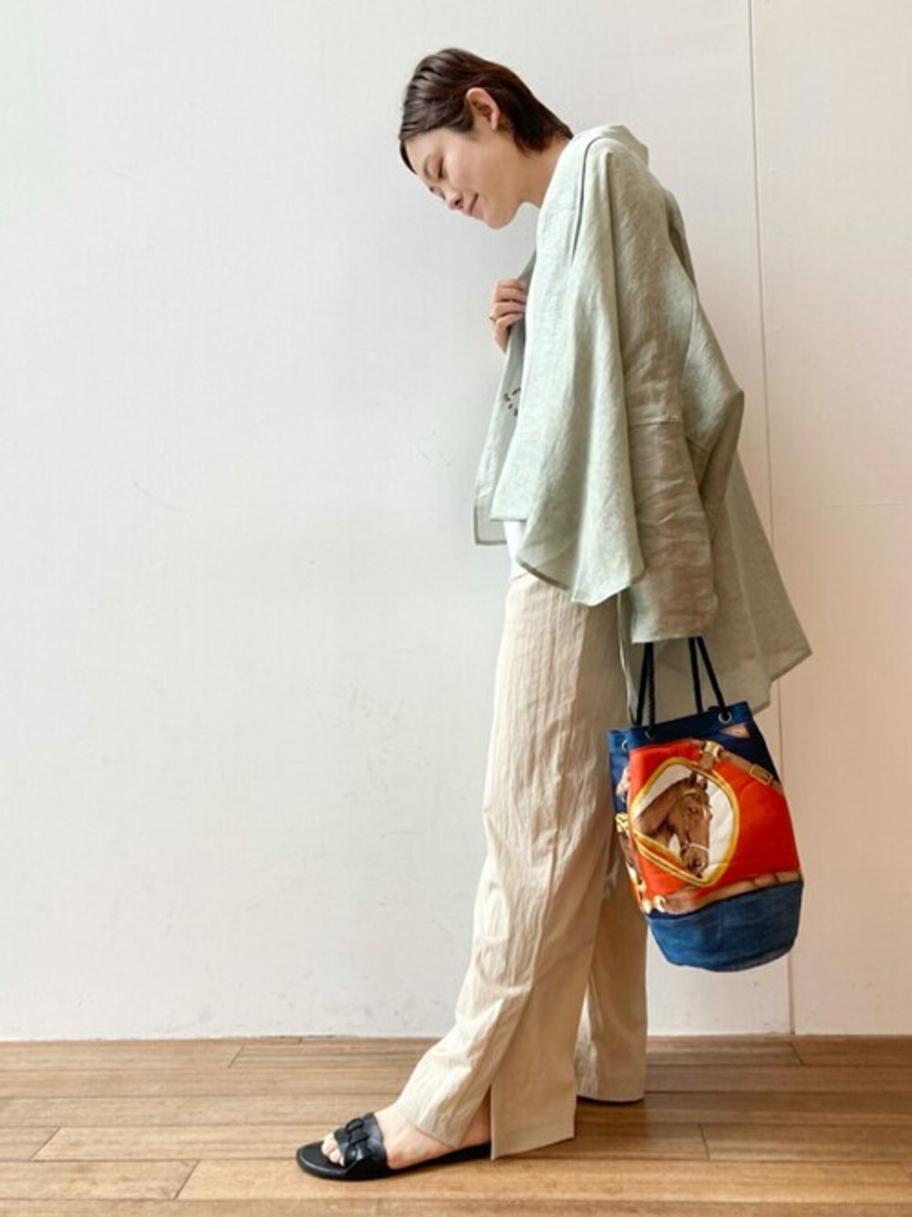 ランキング上位アイテムコーディネート(5月29日付) シャカシャカトラックバギーパンツ ¥22,000税込 【bottom】着用サイズ:1 エジポゴムのゆったりと履けるワイドパンツ。 裾スリットがスッキリと見せてくれます。 洗濯 :手洗い可 伸縮性:なし 透け感:なし 裏地 :なし 【outer】着用サイズ:F ムラ染の柔らかいカラーが合わせやすい色味。 着心地もとても軽く涼しく着ていただけます。 洗濯 :手洗い可 伸縮性:なし 透け感:あり 裏地 :なし 光沢感:なし 【shoes】着用サイズ:38size(24.5~25cm)