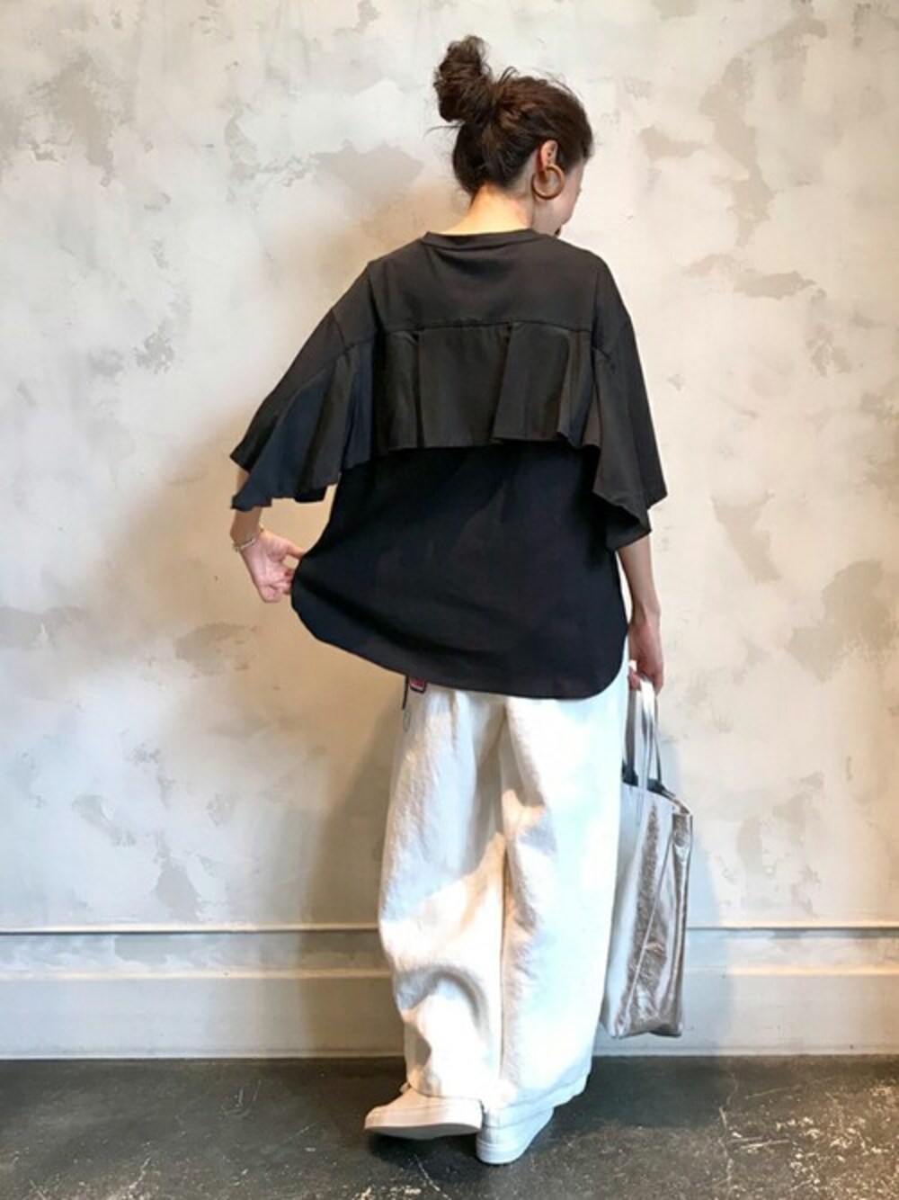 ランキング上位アイテムコーディネート(5月31日付) 後ろフリルTシャツ ¥17,600税込 【cutsewn 】着用サイズ:F 背中のフリルがポイントのカットソー。 前身頃は綿、フリル部分はポリエステル素材。 お袖は肘が隠れる長さで安心感があり、 着丈もお尻が隠れる長さなのですっきりしたパンツでも合わせられます。 1枚でぱっとオシャレに着られるカットソーは これからの時期重宝しそうです。 洗濯 :手洗い可 伸縮性:あり 透け感:なし 裏地 :なし 光沢感:なし 【pants】着用サイズ:F ひとつひとつ違うヴィンテージワッペンがポイントのリネンパンツ。 カットソーにスリットが入るので、ワッペンがチラッと見えます。 洗濯 :手洗い可 伸縮性:なし 透け感:多少あり 裏地 :なし 【bag】 MARCO MASIのレザートートバッグ。 シルバーのカラーは夏場のTシャツスタイルに合わせると 一気にお出かけコーディネートになります。 ショルダーベルト付き。 【shoes】着用サイズ38 かかと部分がシルバーのAnthology Parisのスニーカー。 歩いたときにチラッと見えるのもオシャレ。