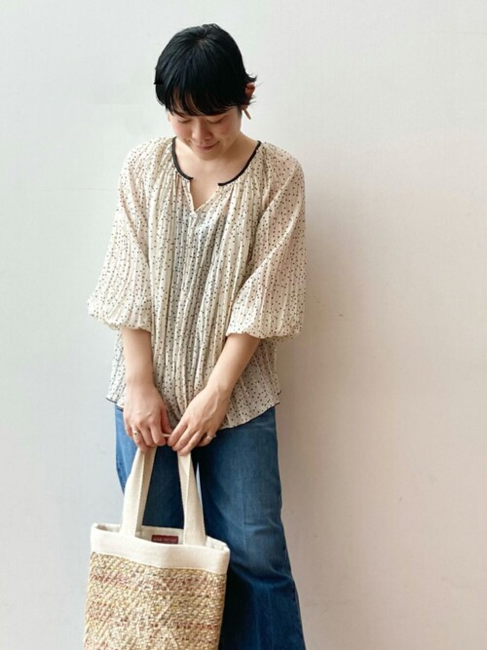 ランキング上位アイテムコーディネート(6月1日付) ドットプリーツブラウス ¥18,700税込 【tops】Fサイズ 透け感のある薄手のブラウス。 ふんわりと軽やかで着心地もかなり楽になっています。首元にはボタンも付いているので、お好みでバランスを調節していただけます。 【pants】26インチ着用 truenycのデニムを着用しています。 スッキリとしたワイドパンツのシルエットです。裾の切りっぱなしがアクセントに。