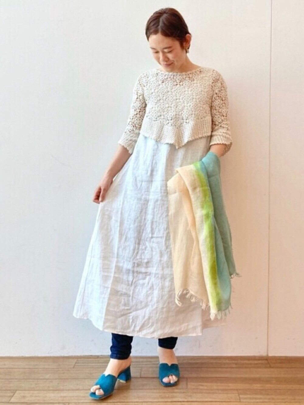 ランキング上位アイテムコーディネート(6月4日付) かぎ針ニット&リネンOP ¥57,200税込 【one-piece】 ニットとワンピースがセットになった雰囲気のあるワンピース。トップスのニットは後ろが編み上げになっているのでサイズ調節もしていただけます。インナーのワンピースは胸元までがカットソーで伸びるお素材になっています。 【pants】1サイズ 伸びの良いデニムパギンス。 しゃがんでも楽な優秀パンツです。 【sandal】38サイズ 太めのヒールで安定感のあるファビオのサンダル。高さも低めなので普段から使いやすそうなデザイン。