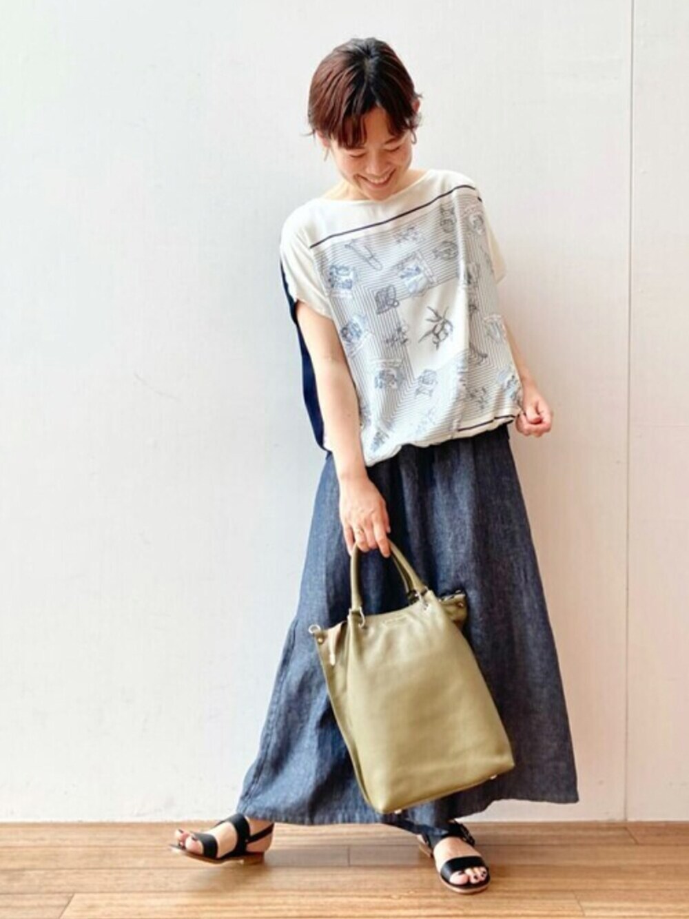【tops】着用サイズ:1 ゆったりと涼しく着れるブラウスとニットが組み合わさったトップス。 ヒップ辺りまでの丈感で、細身のパンツとも着やすい丈感。 洗濯 :手洗い可 伸縮性:あり 透け感:なし 裏地 :なし 光沢感:なし 【bottom】着用サイズ:1 ビアズリー 定番のバギーパンツ。 涼しく楽に着ていただけるデザインです。 サイズは今回は真ん中の1サイズを着用。 今までのフリーと同じサイズ感です。 洗濯 :手洗い可 伸縮性:なし 透け感:なし 裏地 :なし 【shoes】着用サイズ:38size(24.5~25cm)