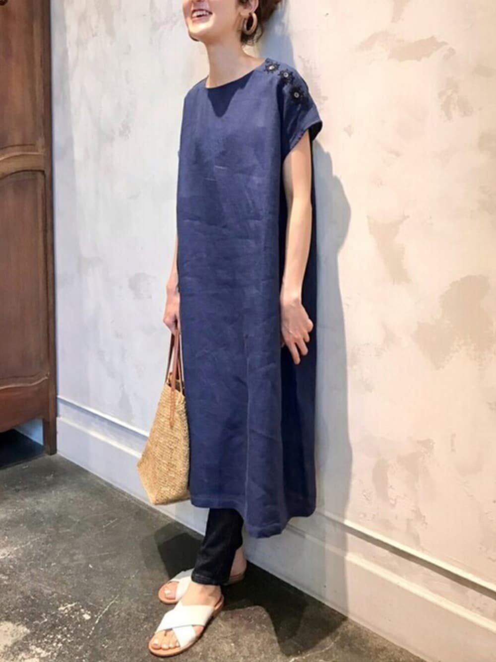 【one-piece】着用サイズ:F リネン100%の身頃シンプルなワンピース。 左肩のボタンホールの刺繍がワンポイントでビアズリーらしい。 私の身長で膝が隠れる長さ。 お袖もフレンチスリーブより長めのデザインで着やすいです。 洗濯 :ドライクリーニング推奨 伸縮性:なし 透け感:なし 裏地 :なし 【pants】着用サイズ:0 伸縮のある生地ではき心地抜群。 0サイズで着丈スッキリ合わせています。 洗濯 :手洗い可 伸縮性:あり 透け感:なし 裏地 :なし 【bag】 Sans Arcidet/サン・アルシデ ¥22,000 【shoes】着用サイズ38 合わせやすくてオシャレなAnthology Parisのクロスサンダル。 ホールド感もあってはきやすいです。