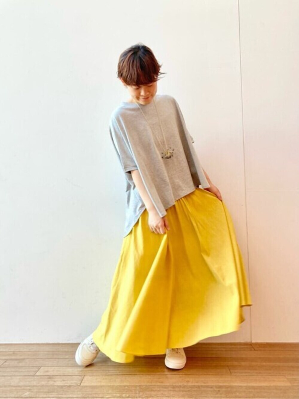 いつもご覧いただきありがとうございます。 【tops】着用サイズ:F 肘までの長さが嬉しいシンプルなTシャツ。 お尻まで隠れるのでパンツスタイルでも安心の丈感になっています。 ブルーとグレーの2色展開。 洗濯 :手洗い可 伸縮性:あり 透け感:なし 裏地 :なし 光沢感:なし 【bottom】着用サイズ:F 鮮やかな黄色が夏らしいスカート。 ウエスト周りをスッキリと見せてくれるデザインです。パープルとの2色展開です。 洗濯 :手洗い可 伸縮性:なし 透け感:なし 裏地 :なし 【shoes】着用サイズ:38size(24.5~25cm) 【bag】 細かい刺繍が目を惹くバッグ。 バケツのようなシルエットも印象的です。
