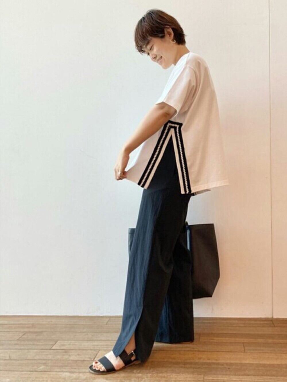 いつもご覧いただきありがとうございます。 【tops】着用サイズ:F サイドの大きなスリットが目を惹くデザイン。 横から見た時もスッキリと脚長な印象に。 洗濯 :手洗い可 伸縮性:あり 透け感:なし 裏地 :なし 光沢感:なし 【bottom】着用サイズ:1 ワイドパンツでも細身に見えるシルエット。 ウエストはゆったりとゴムの仕様です。 洗濯 :手洗い可 伸縮性:なし 透け感:なし 裏地 :なし 【shoes】着用サイズ:38size(24.5~25cm) 【bag】 表面がコーティングされている素材なので、雨の日も気にせずに使いやすいです。