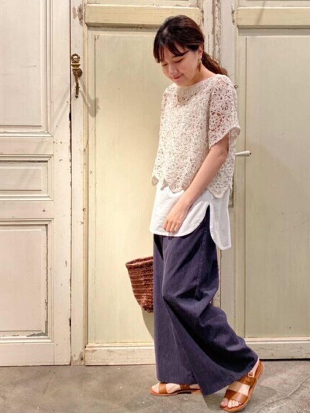 【tops】着用サイズ:F レース刺繍のニットにタンクトップがセットになったアイテム。 麻混の透け感のあるニットなので 夏らしく爽やかな印象に。 お手持ちのワンピースやカットソーに 合わせて着るのもおすすめです。 洗濯 :レーストップス→ドライクリーニング タンクトップ →手洗い可 伸縮性:あり 透け感:あり 【pants】着用サイズ:1 定番人気のウエストリブシリーズ。 麻が混紡されているので蒸し暑い夏でも さらっと軽やかに着れます。 1サイズでくるぶしが隠れる着丈です。 洗濯 :手洗い可 伸縮性:ウエスト部分あり 透け感:なし 裏地 :なし 【bag】 dragon / ドラゴン 【shoes】 FABIO RUSCONI / ファビオ・ルスコーニ