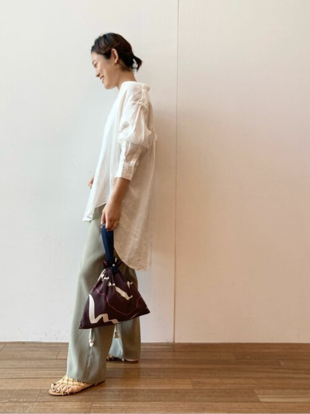 【tops】着用サイズ:F リネンシャツ ¥22,000 → ¥11,000(税込) (50%OFF) 何かと使えるリネンのシャツ。 羽織としても長く使えそうです。 洗濯 :手洗い可 伸縮性:なし 透け感:なし 裏地 :なし 光沢感:なし 【bottom】着用サイズ:2 店頭でも人気のナゴミパンツ。 涼しく履けて皺が気にならないのが嬉しいポイント。今回はゆったり履ける2のサイズを着用。 洗濯 :手洗い可 伸縮性:なし 透け感:なし 裏地 :なし 【shoes】着用サイズ:38size(24.5~25cm) sample 【bag】 波柄バッグ ¥9,900 → ¥4,950(税込) (50%OFF) ビアズリー オリジナルバッグ。 個性的な柄がアクセントに。