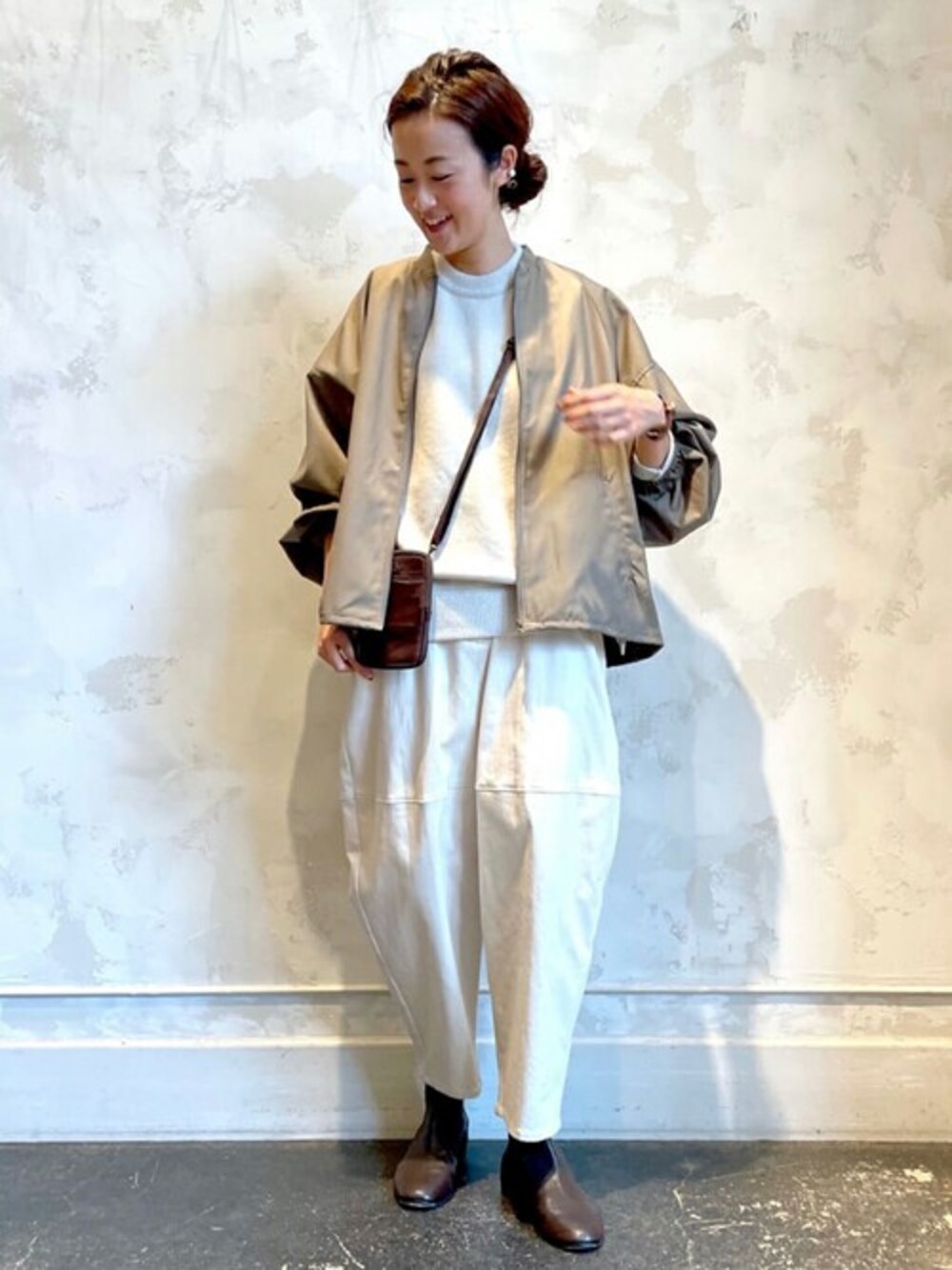 【blouson】着用サイズ:F お袖がたっぷりドルマンなブルゾン。 ちょっとしっかりした羽織ものが欲しい時にかなり重宝しそう。 裏地なしで軽く、お袖もゆったりしているのでパーカーやタートルなど重ねて時期長く使っていただけます。 着丈はお尻半分くらいのスッキリ丈。 裾を絞って女性らしくも着ていただけます。 今回はパンツにボリュームがあったので絞らずに合わせました。 洗濯 :ドライクリーニング 伸縮性:なし 透け感:なし 裏地 :なし 光沢感:多少あり 【knit】one size 《roberto collina》ニット BEZ1012205D0008 ¥41,800(税込) イタリアのニットブランド《ROBERTO COLLINA》よりシンプルで上質なニットが入荷しています。 脇の部分がポイントの、ウール90%・カシミヤ10%のハイゲージニットはご自宅で手洗いできる嬉しい仕様です。 洗濯 :手洗い可 伸縮性:あり 透け感:なし 【pants】着用サイズ:1 コクーンシルエットのボリューム感が素敵なパンツ。 コンパクトなトップスはもちろん、ボリュームのあるウールのニットに合わせてもかわいいです。 1サイズ着用でくるぶしが出る着丈です。 洗濯 :手洗い可 伸縮性:あり 透け感:なし 裏地 :なし 【bracelet】 CAMPO MAGGIのレザーアクセをポイントに。 大きめパーツがシンプルなコーディネートのアクセントになります。 【bag】 HARBOUR 2ndのミニショルダーはブルゾンやコートの下に合わせるとモタつかず、すっきりおさまります。 【shoes】着用サイズ:38 人気のKUDETAは柔らかく軽いレザー履きやすい。 小物やシューズはブラウンカラーでまとめて統一感を出しました。