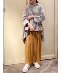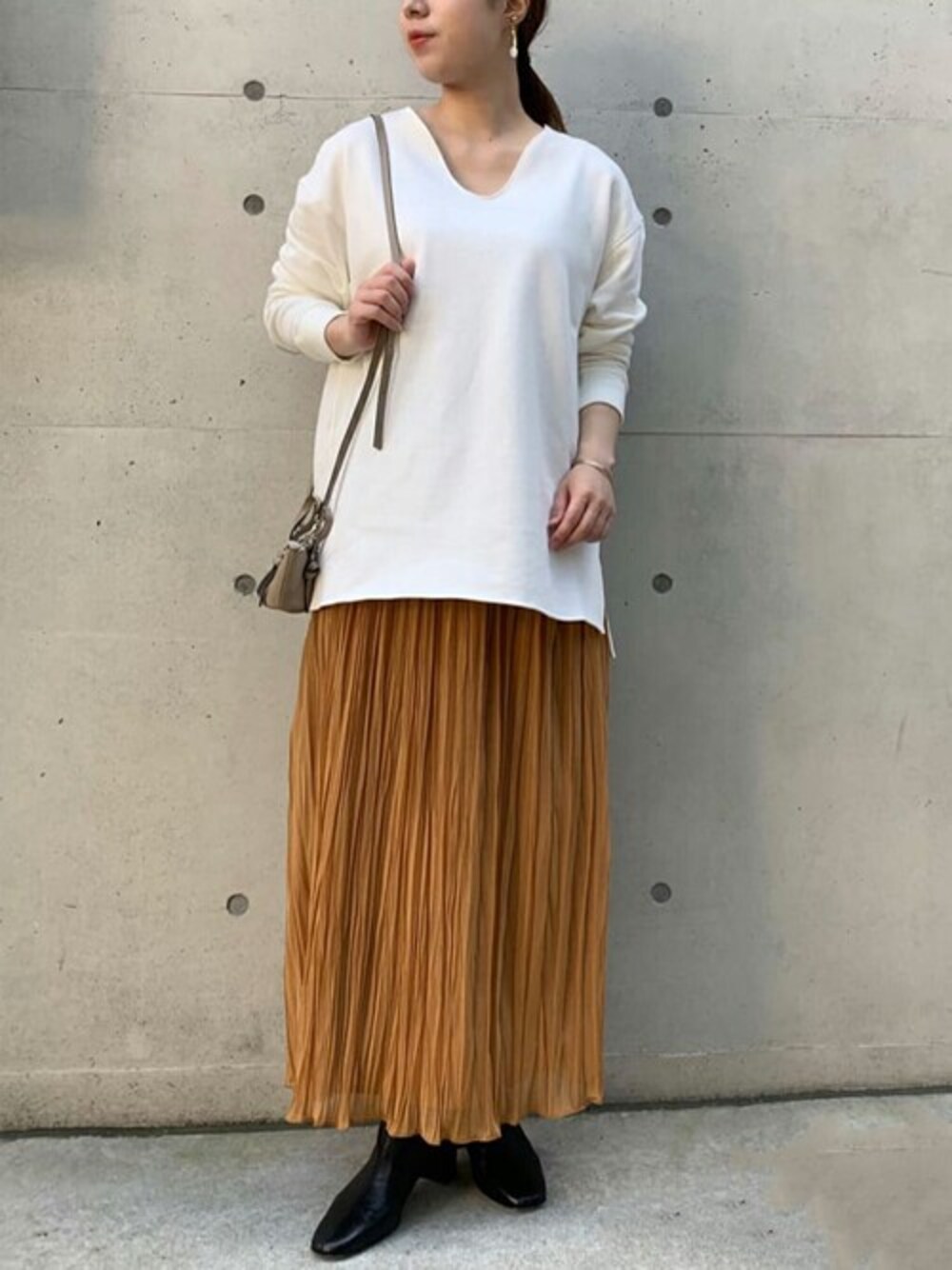 【tops】着用サイズ:F 首元が綺麗にみえるVネックのトレーナー。 カジュアルなスウェット素材ですが、デコルテが見えているのでキレイめなスカートでも合わせて頂けます。 幅はゆったりめで後ろはお尻が隠れる丈です。 ストレートなシルエットなので細見えします。 伸縮性:あり 透け感:白のみ若干あり 裏地 :なし 【bottom】着用サイズ:F しわ加工プリーツが施されたスカート。 さらさらな生地で履き心地も良いです。ロングスカートですが軽いので動き易さも◎ ウエストもゴムなので楽ちんです。 160センチで足首が隠れる丈です。 ※ブラウン着用 伸縮性:ウエスト部分はあり 透け感:グレーは若干あり 光沢感:なし 【bag】《GIANNI NATARO CAROL J》ミニショルダーバッグ アクセサリー感覚で身に付けていただけるミニショルダーバッグ。 クレジットカード、リップクリームなどがちょうど入る大きさです。 【shoes】着用サイズ:38 FABIO RUSCONIのショートブーツ 安定感のある太いヒールであまりヒールを履かない方でも履きやすいです。 本革も柔らかく歩きやすいです。