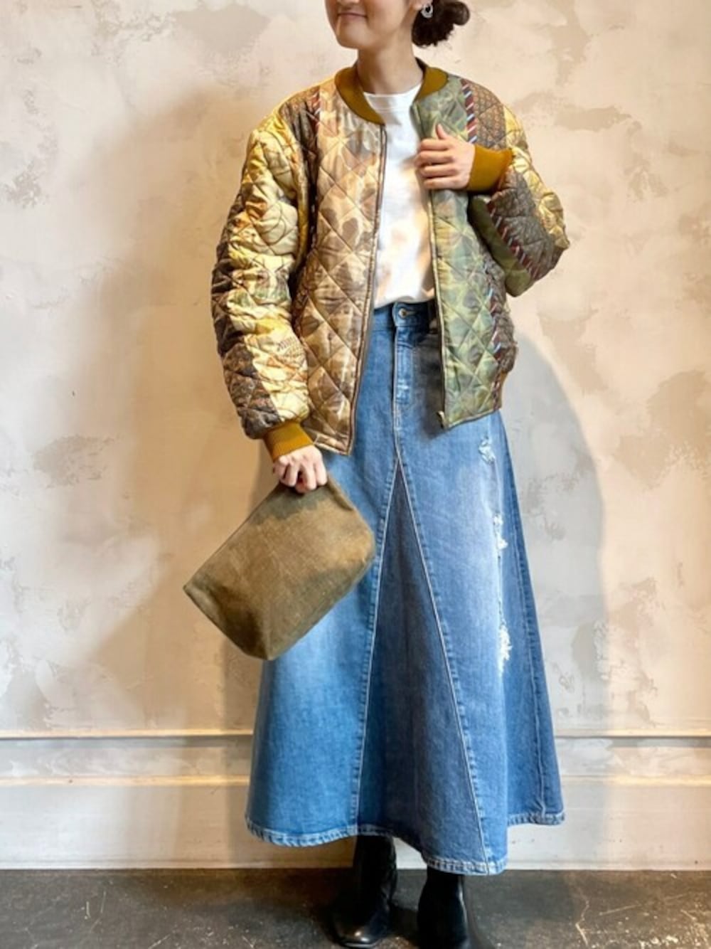 【blouson】着用サイズ:F Pierre-Louis Masciaのリバーシブルブルゾン。 カモフラージュ柄や壁画のようなレトロな草花柄の組み合わせが他では出会えない特別な1枚。 裏表で全く違う印象になるので柄物、無地のお洋服問わずに合わせられますね。 すっきりした着丈なのでスカートやワンピースに。 ロングシャツの上に羽織ってスッキリしたパンツを合わせてもまた素敵です。 キルティングでしっかり暖かさもあります。 プリント面:ポリエステル51% 絹36% ウール13% 無地面:シルク100% ※9/24より店頭に並びます。 洗濯 :ドライクリーニング 伸縮性:なし 透け感:なし 裏地 :リバーシブル 光沢感:多少あり 【skirt】着用サイズ:26〜28 true nyc.のデニムスカート。 さりげなく入るダメージ加工が程よくこなれた雰囲気になるスカートです。 私の身長でくるぶしがしっかり見える着丈なのでブーツを合わせても重たくなりません。 洗濯 :手洗い可 伸縮性:なし 透け感:なし 【bag】 YVES ANDRIEUXのポーチはマチもあるので貴重品しっかり入る大きさで合わせやすいです。 【shoes】着用サイズ:38 KUDETAのショートブーツはきれいめにもカジュアルにも使える人気のブーツ。 サイズがあるうちにご覧くださいね。