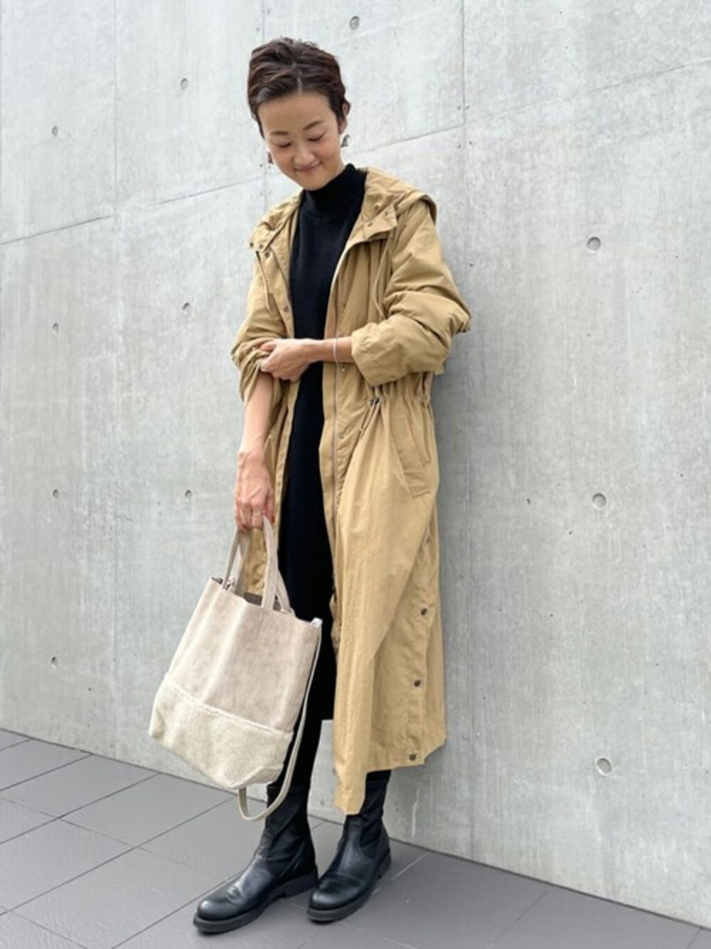 【coat】着用サイズ:F ナイロン素材の軽いコート。 取り外しのできるフード付きで、思い切りカジュアルに合わせても良いですし、トレンチコートのデザインも入るのでワンピースやスカートと合わせても馴染みます。 裏地なしで軽く、ウエストのコードでボリューム感を簡単に変えられます。 着丈は私の身長ですねの真ん中あたり。 サイドのボタンでスリットの長さも調節ができるので、スカートなどをのぞかせても素敵。 ボタンをすべて閉めるとスタンドカラーのコートとしても使えます。 伸縮性:なし 透け感:なし 裏地 :なし 光沢感:ナイロンの光沢少しあり 【one-piece】着用サイズ:1 ハイネックのリブニットワンピース。 お袖のボリュームが素敵です。 ブラックのカラーはぐっと締まった印象になり、小物次第で綺麗めにも使えます。 洗濯 :ドライクリーニング 伸縮性:あり 透け感:なし 裏地 :なし 【bag】 MARCO MASIのスエードとファーのコンビバッグ。 使いやすい大きさと、軽さがポイントです。 【shoes】着用サイズ:38 人気のFABIO RUSCONIのミドルブーツ。 ジップがないのでスリッポンのように履ける楽さと、見た目よりもかなり軽い履き心地が魅力です。 サイズがあるうちにお早めにご覧くださいね。