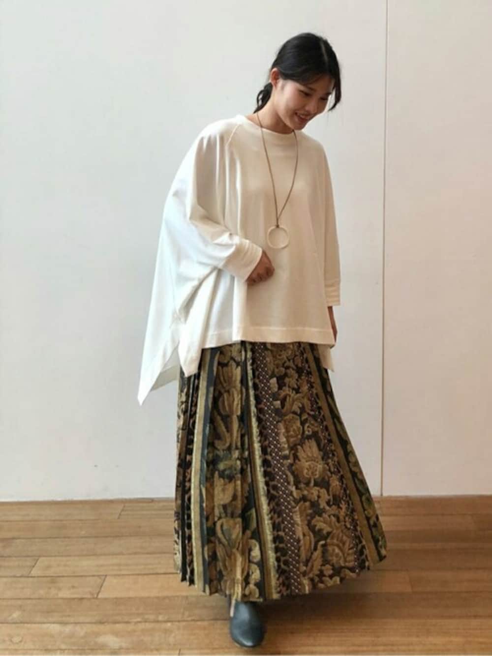 【tops】着用サイズ:F BIGラグランTシャツ ¥18,700 → ¥9,350(税込) (50%OFF) 肩から脇にかけて大きく縫い目が入ったBIGシルエットのラグランスリーブのトップスです。 コットン100%で、裏毛よりは薄手で、厚めのTシャツ感覚で着ていただけます。 ヒラヒラと動くシルエットは、動く度にきれいです。 洗濯 :手洗い可 伸縮性:あり 透け感:ややあり 裏地 :なし 光沢感:なし 【bottom】着用サイズ:F ゴージャスな柄がコーディネートのアクセントになるスカート。 ウエストは総ゴムな為、楽ちんに履くことができます。 プリーツスカートになっていることで、ストンと綺麗なシルエットに見せてくれます。 洗濯 :ドライクリーニング 伸縮性:なし 透け感:なし 裏地 :なし 【shoes】着用サイズ:36size(23.5~24cm) 優しい履き心地なレザーシューズ。 レザーですが、柔らかい為、重たい印象になりすぎないところが魅力的です。