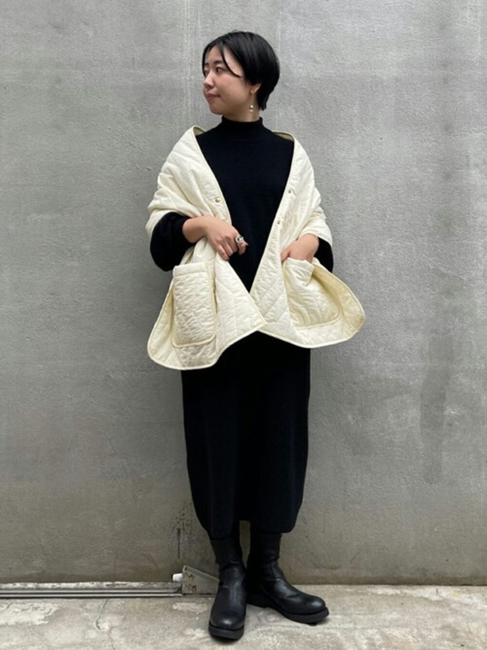 【stole】 カジュアルだけど、お洒落に見せてくれるストール。 ボタンもついているので、なで肩で落ちるのがストレスに感じていた方にも是非使っていただきたいアイテムです。 アウターとは、ボタンで留めることが出来ることも可能。 【outer】Fサイズ メンズライクなシャツジャケット。 ゆったりしたオーバーサイズですが襟付きなのですっきりした印象です。 【one-piece】普段Fサイズ着用:今回の着用は1サイズ 柔らかく軽い着心地のニットワンピース。シンプルで何にでも合わせやすく一枚あると便利です。ハイネックの首元はコートの隙間からの風も防いてくれて暖かく過ごせます。 160cmでふくらはぎが隠れる着丈なので、一枚でも安心な長さ。 程よく厚みもあるので、体のラインも気にしなくてよいのも嬉しいです。 【shoes】37サイズ 購入逃した方は、是非オンラインストアでご予約を。 足首部分がストレッチの効いた素材なので、履きやすくそれでいて軽いです。