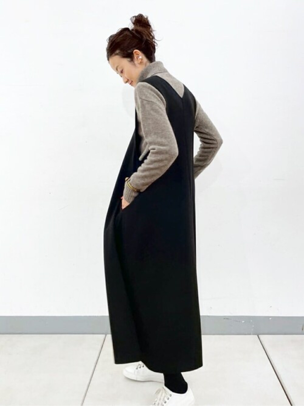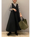 【knit】着用サイズ:F モカの色合いが素敵なハイネックニット。 ウール100%でほっこり温かみがあります。 生地も厚すぎないのでインナーにもできちゃうニットです。 後ろの裾にスリットが入っていて、後ろはお尻隠れる着丈があります。 洗濯 :ドライクリーニング 伸縮性:あり 透け感:なし 裏地 :なし 【one-piece】着用サイズ:1 伸縮があり着心地抜群のジャンパースカート。 動いた時のフレアシルエットの揺れ感がとても綺麗。 今回はスニーカーでカジュアルに合わせてみました。 ジップなどはなく、すぽっとかぶって着るデザインなのでニットに引っかかったりもなく、脱ぎ着もしやすいです。 脇の部分も広いので、ドルマンのニットも難なく合わせられますよ。 166cmで1サイズ着用、くるぶし上20cm弱の着丈です。 ブーツでもスニーカーでもすっきり着られます。 伸縮性:あり 透け感:なし 裏地 :なし 【shoes】 sample