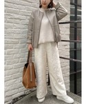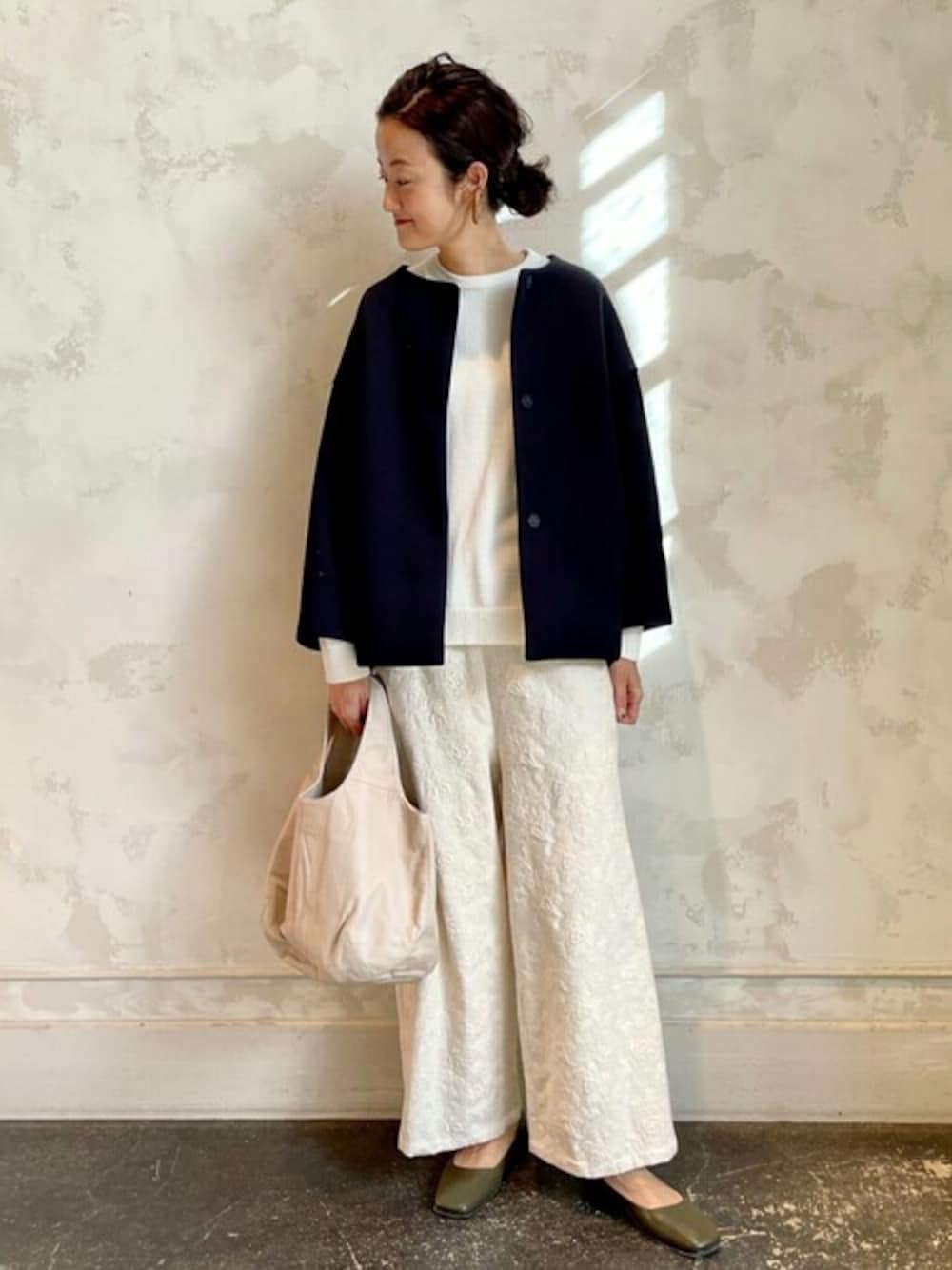 【coat】着用サイズ:F ダンボール生地のショートコート。 ショート丈なので丈の長いワンピースやスカートともバランスが取りやすく、小柄な方もかなり合わせやすいコートです。 私の身長でもおしりほとんど隠れる長さ。 後ろがぷっくりしたシルエットなのが、ビアズリーらしくて素敵ですね。 洗濯 :ドライクリーニング 伸縮性:多少あり 透け感:なし 裏地 :あり 【knit】着用サイズ:F モール糸を使用していて、ふわっと柔らかい素材のニット。 お袖ゆったりで着心地良く、前後差のある着丈がバランス取りやすくて着回ししやすいです。 後ろはおしり隠れる着丈です。 伸縮性:あり 透け感:ホワイトは多少あり 裏地 :なし 【pants】着用サイズ:F フロント刺繍ニットと同素材のウエストリブパンツ。 アイボリーの地に同じ色の刺繍がさりげなくて上品。 ご自宅で手洗いできるのが嬉しい生地です。 Fサイズのみの展開で、私は少し腰で落として穿いています。 洗濯 :手洗い可 伸縮性:なし(ウエストはゴムなのであり) 透け感:薄い色のインナー推奨 裏地 :なし 【shoes】着用サイズ:38 FABIO RUSCONIのスクエアトゥパンプス。カーキのカラーはシーズン問わずに履けて、タイツでも素足でも馴染む色合いです。