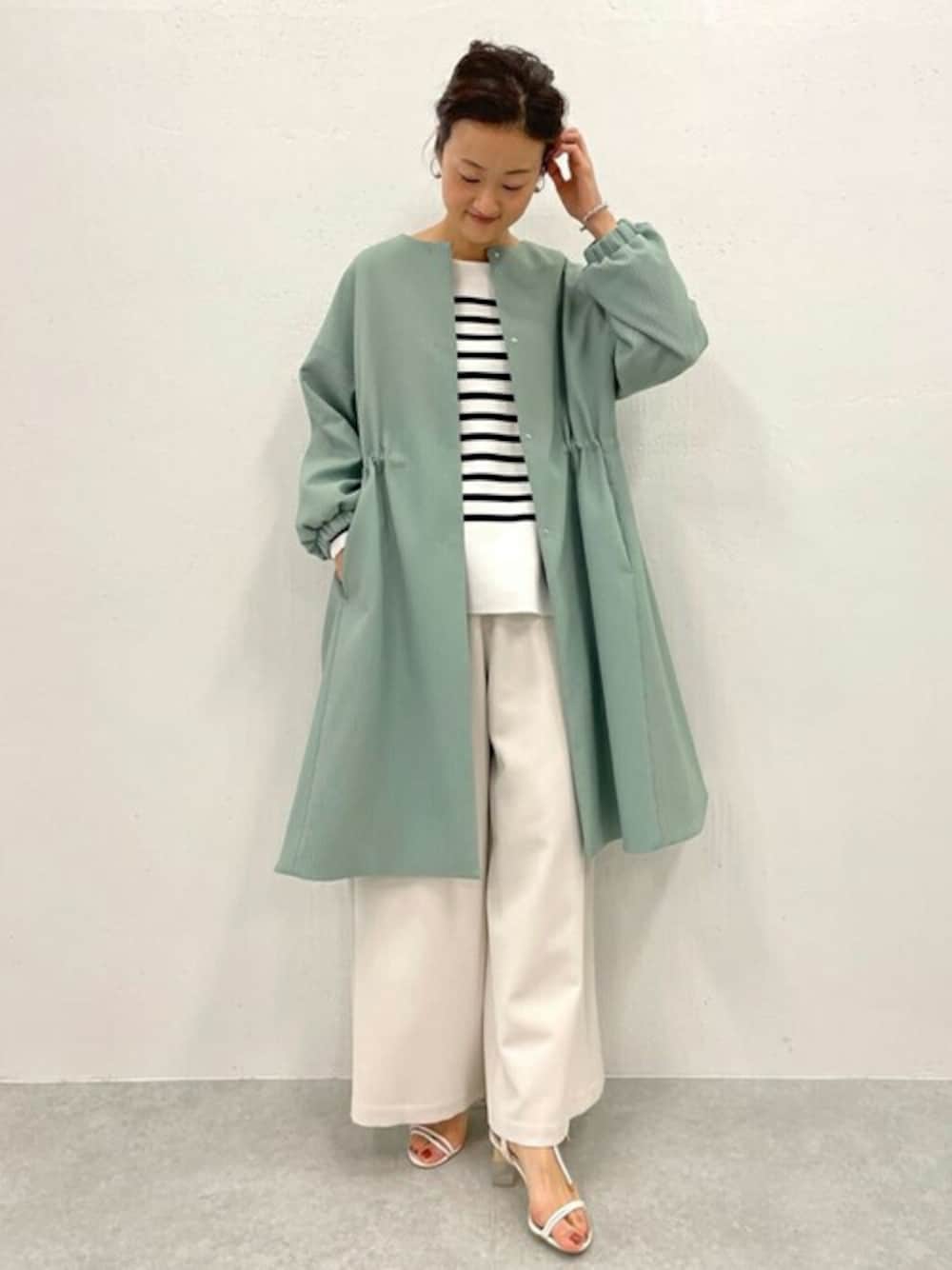 【coat】 きれいなグリーンが目を惹くコート。 ボーダーを入れてカジュアルに合わせました。 お袖にゴム入りのバルーン袖がポイント。 ウエストのドロストでギャザーを寄せてシルエット変えて着られます。 私の身長で膝丈なので身長選ばずに羽織れるコートです。 【knit】Fサイズ ゆったりシルエットで着やすいボーダーニット。 生地も柔らかく、着心地優しい1枚です。 顔まわりや裾は無地なので、すっきり着られます。 【pants】Fサイズ 裏起毛のバギーパンツ。 ウエストは紐で調節できます。