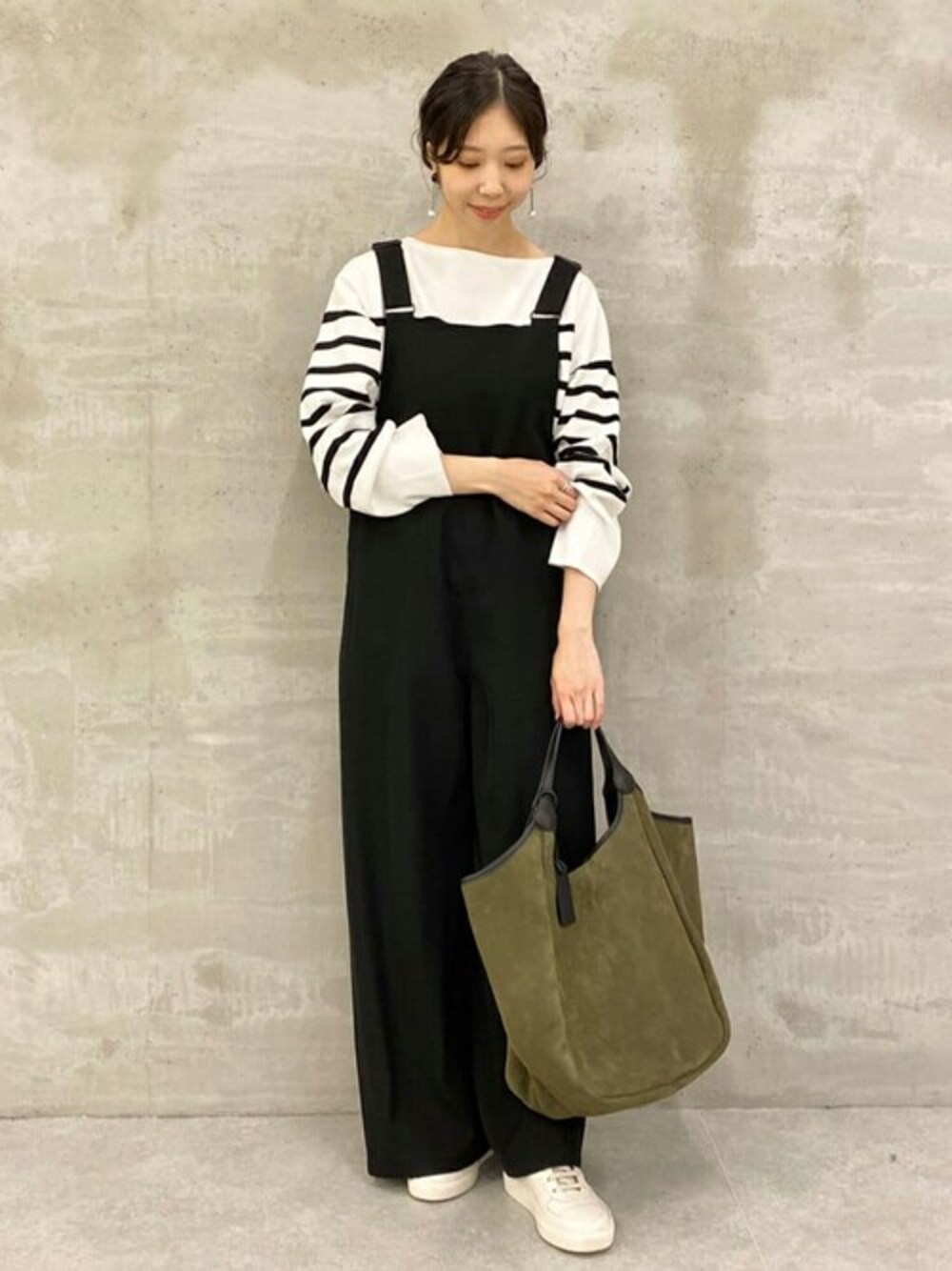 【tops】着用サイズ : Fサイズ オーガニックコットン糸を使用したプルオーバーニット。 そで口は広めで身幅もゆったりとしたシルエットで楽に着れる1枚です。 ボーダーも全体にはデザインされてないのでカジュアルすぎずに使っていただけます。 透け感:なし 伸縮性:あり 光沢感 : なし 【salopette】着用サイズ : Fサイズ ストラップ付きで長さ調整が可能なサロペットです。 程よく光沢感がありカジュアルになりすぎず着ていただけます。 左側にボタンが付いており着脱しやすいつくりになっています。 洗濯 :手洗い可 透け感:なし 伸縮性:なし 裏地 :なし 【bag】 MARCO MASI / スエードバッグ 【shoes】着用サイズ:37 Anthology Paris / スニーカー