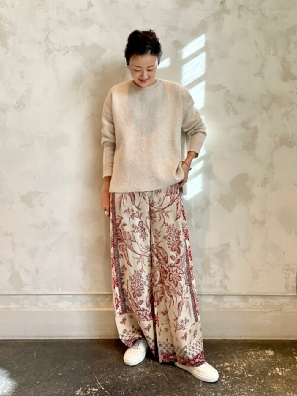 【knit】着用サイズ:F シンプルなラクーンニット。 裏面はポリエステルでチクチク感のない肌触りです。 ニット1枚よりも厚みがあり、しっかり温かい。 サイドスリット入りでバランスがとりやすいです。 洗濯 :手洗い可 伸縮性:あり 透け感:なし 裏地 :なし 【pants】着用サイズ:F 《Pierre Louis Mascia/ピエール ルイ マーシャ》のプリントパンツ。 ベージュの地にボルドーの草木柄。 サイドや裾には違うプリントが入るので、合わせるトップスにより柄の見え方が変わります。 ウエストは総ゴムで、ハイウエストで合わせてフルの長さです。 ウエストを折り返して長さ調節できます。 洗濯 :ドライクリーニング 伸縮性:なし(ウエストはゴムなのであり) 透け感:なし 裏地 :なし 【shoes】 Anthology Paris