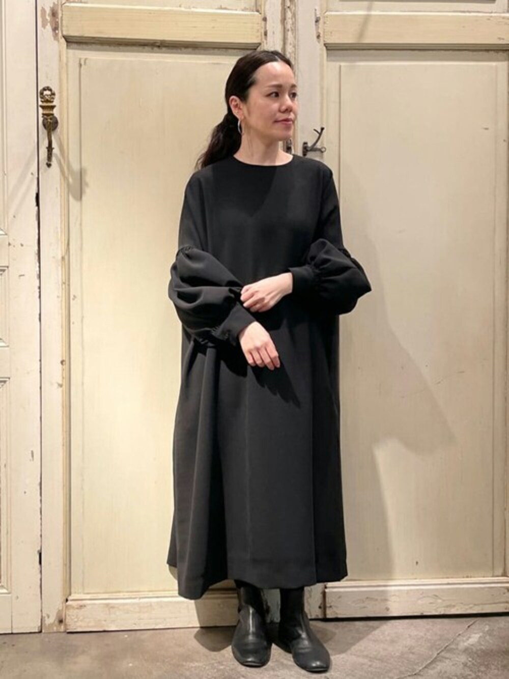 【one-piece】着用サイズ:F 袖のボリューム感が印象的な ロングワンピース 袖の切り替え部分にシャーリングを入れ ボリュームのあるデザインに オーバーサイズですが落ち感のある 柔らかなポリエステルを使用しているので リラックスした着心地です 私の身長で足首がしっかり見えるので 階段を使用するときも安心です 洗濯 :手洗い可 伸縮性:なし 透け感:なし 裏地 :なし