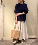 【coat】着用サイズ:F 青山店でもスタッフの半分が購入したZIPUPコート。 綿ポリエステルのしっかりした生地で、まだ肌寒い3月4月に大活躍しそうで着るのが楽しみです。 トレンチコートよりラフに羽織れ、ウエストのドローコードでギャザーを寄せられます。 後ろが長めで、お袖もゆったりなのでボリューム袖のインナーにも羽織りやすいです。 洗濯 :ドライクリーニング 伸縮性:なし 透け感:なし 裏地 :なし 【knit】着用サイズ:F モール糸を使用し、ふわっと肌触りの良いニット。 ベロアのような、しっとりした質感が気持ち良いです。 襟開きもなく、体のラインを拾わないリラックス感のあるゆったりシルエットが気兼ねなく着られるプルオーバーです。 洗濯 :ドライクリーニング 伸縮性:あり 透け感:なし 裏地 :なし 【skirt】着用サイズ:1 ウエストリブのラップスカート。 数年前に出ていた人気のスカート。 シワが気にならず、ご自宅で洗える嬉しい生地。 ニットやパーカーでラフに合わせたり、ジャケットやブラウスを合わせると仕事用やお子様の学校などにも着ていけます。 1サイズ着用でくるぶし上10cmくらいのスッキリ丈。 スニーカーはもちろん、ヒールのパンプスなと合わせてもバランスが取りやすいです。 洗濯 :手洗い可 伸縮性:あり 透け感:なし 裏地 :なし 【stole】 《IMAYIN/イマイン》のプリントストール。 肌触りの良い柔らかいウール生地なので巻いていてストレスがありません。 シンプルコーデのポイントに。 【bag】 ANNE BECKERのジュートバッグ。 太めの持ち手が荷物を入れても食い込みにくく、持ちやすい。 デイリーに使いやすい大きさも人気の理由です。 【shoes】 着用サイズ:38 MAI MAIのスリッポンは脱ぎ履きがしやすくてついつい足が伸びてしまうシューズです。 シューレースのないクラシックな雰囲気は、スカートスタイルにも合う上品なデザインです。