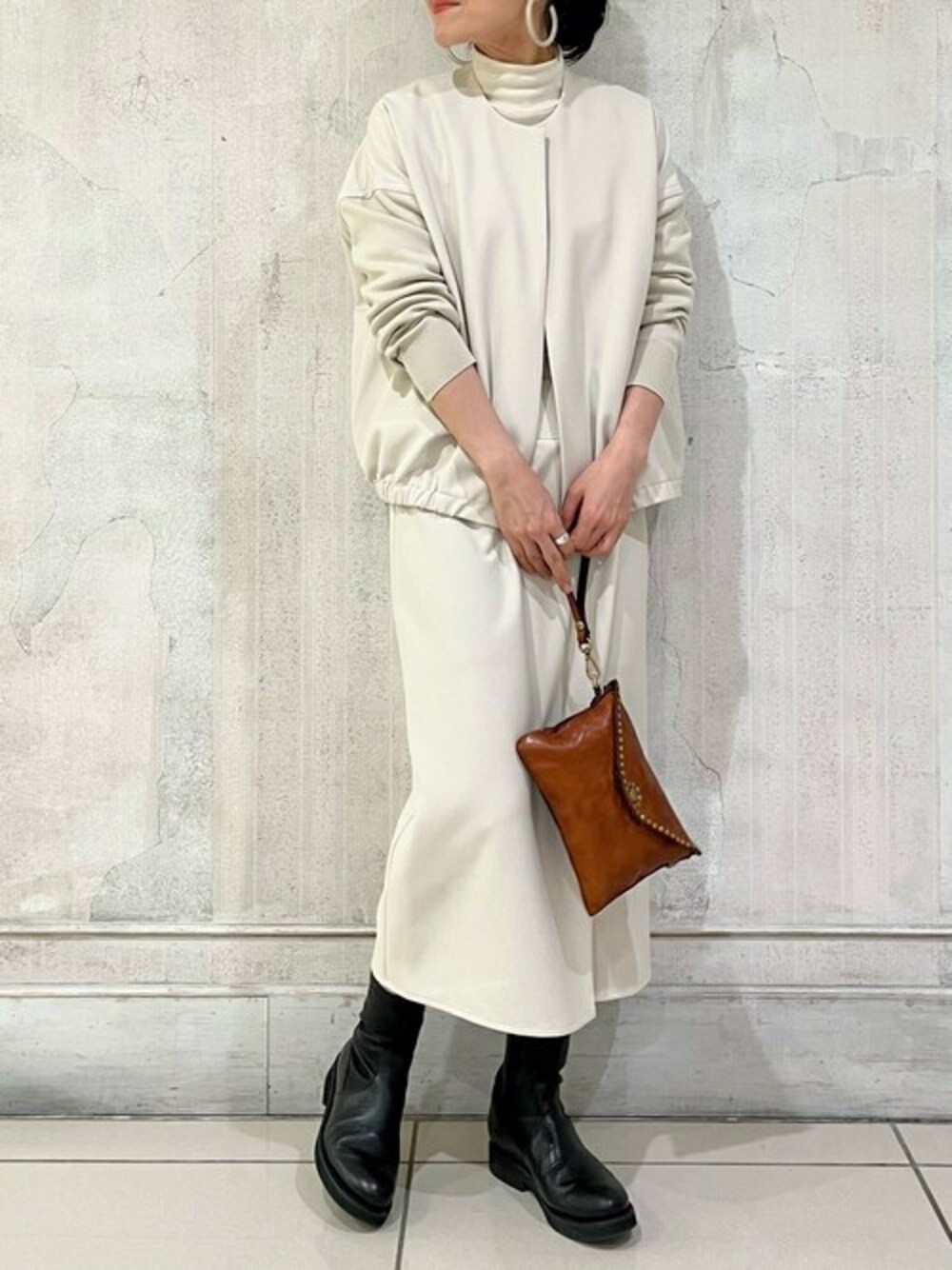【outer】着用サイズ 0size 袖ニットハオリ BEZ1021107A0005 ¥41,800(税込) お袖がリブになった軽やかな羽織り カーディガンのように着て頂けるので、さまざまコーディネートを楽しめる一枚 裏地が付いているので、薄手のニットの上などにも着やすく 厚手過ぎず程よい厚みで、コートの中も着ていただけます。 【inner】着用サイズ F size お家で洗って頂けるウールを使った軽やかなタートルニット 薄手の生地感なので、インナーにお使いいただくのが、オススメです。 ウール100%なので、柔らかくチクチクしないのも嬉しいポイント 【skirt】着用サイズ 0size スッキリとしたシンプルなスカート ツルっとした生地なので、スッキリと軽やかな印象 たっぷりとしたニットと合わせても可愛い一枚 【bag】 「CAMPOMAGGI/カンポマッジ」 人気の小ぶりなバックが再入荷しました。 ポケットもしっかりと付いていて使いやすく ショルダーにできる持ち手も付いているので、普段サブバックとしても使いやすいアイテムです。