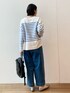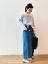 【tops】着用サイズ:F ゆったりとしたシルエットが可愛いボーダーニット。爽やかなブルーと安定のブラックボーダーの2色展開。2色揃えたくなるくらいおすすめです。 洗濯 :手洗い可 伸縮性:あり 透け感:なし 光沢感:なし 【bottom】着用サイズ:2 ゆるっとしたシルエットとウエストロープのデザインが印象的なデザイン。 ストレッチもあるのでデニムですが穿いていてとても楽ちんです。 洗濯 :手洗い可 伸縮性:あり 透け感:なし 裏地 :なし 【shoes】着用サイズ:38size(24.5~25cm) 柔らかい履き心地のファビオのフラットシューズ。ギラギラ感のないシルバーなのでコーディネートにも合わせやすいです。 【bag】 加工感のあるレザーが雰囲気たっぷりなリュック。丸みのあるシルエットが可愛らしいデザイン。