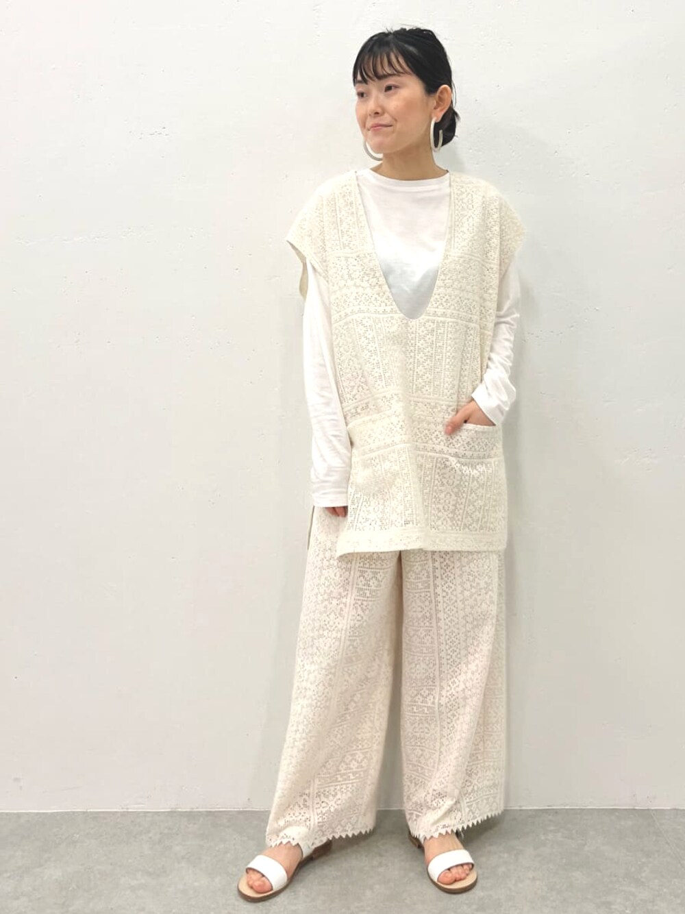 【vest】着用サイズ F size (予約商品) 春らしいレースの軽やかなトップス インナーで雰囲気が変わり、さまざまなコーディネートを楽しんでいただけます。 【pants】着用サイズ 1size (予約商品) 総レースのパンツですが、レースが重たくないので、軽やかに穿いていただけます。 ビアズリーらしい定番のウエストゴムタイプのパンツなので、穿きやすくストレス無く着れるパンツ 私の身長ですと、少し長めなので ハイウエスト気味に穿いていただくか、一つ折って頂くのがオススメです。 小柄な方は0サイズもご用意しているので、そちらもオススメです。
