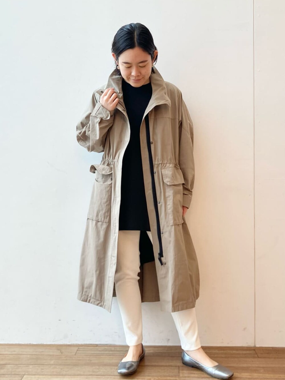 【tops】着用サイズ:F サラサラとした肌触りのカットソー。 後ろが少し長めのデザインでバランスも簡単に取りやすいです。 洗濯 :手洗い可 伸縮性:あり 透け感:なし 光沢感:なし 【outer】着用サイズ:F トレンチ風ですがかっちりとしすぎない雰囲気で着れる春のコート。 肩周りもゆったりとしているので中に着るお洋服も選びません。素材もしっかりめなのでまだ寒い春の時期からしっかりとお使いいただけます。 洗濯 :ドライクリーニング 伸縮性:あし 透け感:なし 裏地 :なし 【bottom】着用サイズ:1 定番タックパンツよりもスッキリとしたライン。シワも気にならないので普段使いからお仕事用にも活躍してくれそうです。 洗濯 :手洗い可 伸縮性:あり 透け感:なし 裏地 :なし 【shoes】着用サイズ:38size(24.5~25cm) 柔らかい履き心地のファビオのフラットシューズ。ギラギラ感のないシルバーなのでコーディネートにも合わせやすいです。
