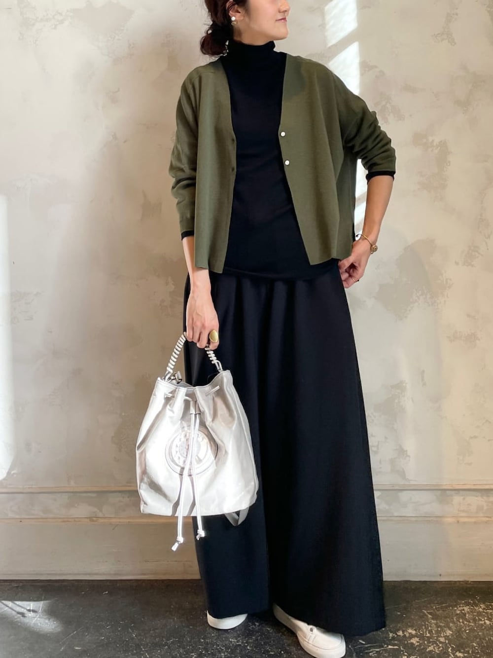 【cardigan】着用サイズ:F 前回大人気だったサラッとカーデ。 新色のカーキはカーディガンとしては珍しいカラーで新鮮です。 ブラックトーンで合わせてシックに、またグレーやベージュなど、色の濃淡問わずに合わせられる春色カーキ。 普段色物を着ない方もちょっと差し色で気分を変えるのも良いと思います。 前後差のあるショート丈なのでバランスもとりやすく、後ろ裾のスリットもワンポイントです。 17日よりご予約開始です。 洗濯 :手洗い可 伸縮性:あり 透け感:カーキはなし 裏地 :なし 【highneck】着用サイズ:F 伸縮性抜群のウールテレコタンク。 薄手なのでカーディガンの下に重ねてももたつきません。 洗濯 :手洗い可 伸縮性:あり 透け感:ホワイトはあり 裏地 :なし 【pants】着用サイズ:2 裏起毛素材のバギーパンツ。 真っ黒ではなく柔らかい印象の黒なので、まだ肌寒い春先も重宝します。 ウエストの紐でサイズ調整ができ、腰の留める位置で長さも多少変えられます。 2サイズでくるぶしくらいの長さです。 洗濯 :手洗い可 伸縮性:あり 透け感:なし 裏地 :なし 【bag】 latilde. 【shoes】 sample