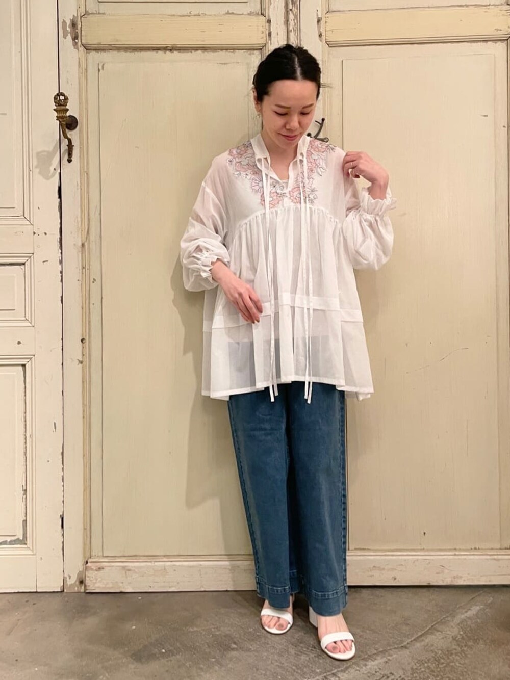 【tops】着用サイズ:F 《HiROMITHiSTLE》ブラウス ¥29,700(税込) 人気のヒロミシスルが入荷しました 襟元に施された上品で繊細な刺繍が ステキなブラウス 透け感のある素材が 軽やかで春らしい印象です 袖口にはゴムが入っているので キュッとたくし上げると フワッとボリュームが出ます 腰周りまでしっかりと長さがある 嬉しいデザインです 洗濯 :ドライクリーニング推奨 伸縮性:なし 透け感:あり 裏地 :なし 【bottom】着用サイズ:0 デザイン違いのボタンがアクセントになった デニムバギーパンツ 前開き部分に4つボタンをあしらっているので トップスの裾からちらっと見せたり タックインしてコーディネートのポイントに 身長に合わせて選べる2サイズ展開です 洗濯 :手洗い可 伸縮性:あり 透け感:なし 裏地 :なし