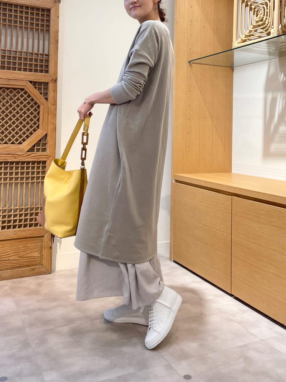ニットチュニックにシフォン素材のギャザーパンツでワンピース風にコーディネート。 肩掛けできて軽いNOVIAのバッグでアクセントを。 【knit】着用サイズ:F 鹿の子生地のニットチュニック。 私の身長でも膝下まで長さがあるので、レギンスやパギンスなどで軽く合わせられます。 とても伸縮があり、身幅たっぷりですが落ち感のある生地なので、楽してオシャレが楽しめます。 襟ぐりも開かないのでインナー気にせずに合わせられます。 真夏以外なら着られる生地感なのでシーズン長く使えます。 洗濯 :手洗い可 伸縮性:あり 透け感:なし 裏地 :なし 【pants】着用サイズ:1 スエードタッチのギャザーパンツ。 ふわりと軽く、歩くと風になびく。 パンツになっているので、階段など降りる時もめくれあがったりしないのが嬉しいです。 1サイズでくるぶししっかり見える着丈ですっきり穿けます。 洗濯 :手洗い可 伸縮性:なし 透け感:なし 裏地 :なし 【bag】 レザーとラフィアの組み合わせで軽い印象になるNOVIAのバッグ。 トレンドのカラーも小物なら抵抗なく取り入れられます。 肩掛けできる持ち手も使い勝手が良いです。 【shoes】 MAI MAI