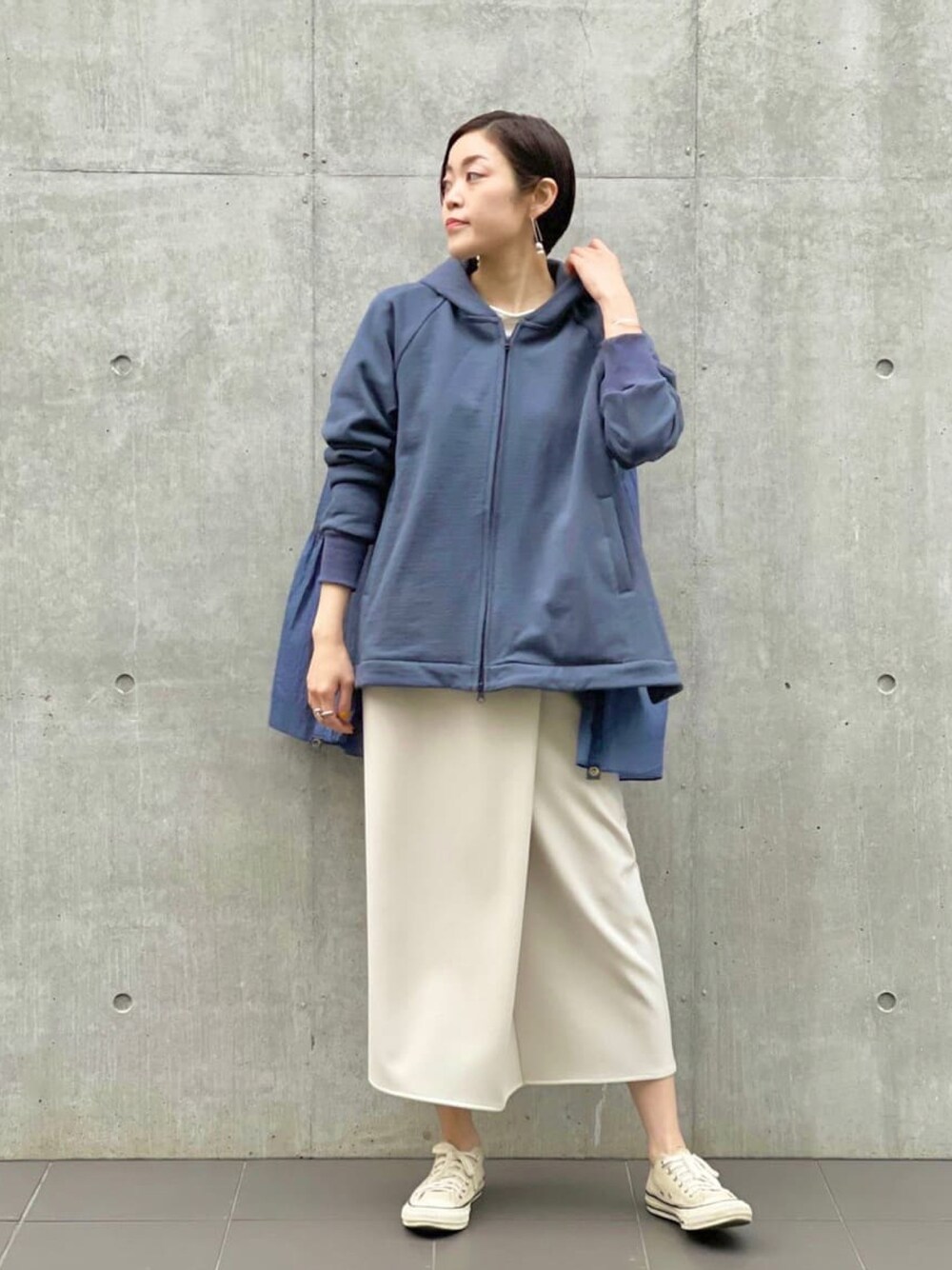 【ハオリ】着用サイズ:F 後ろ身頃は、テントスカートの様にギャザーをふんだんに用い、テントを纏っているかのようなイメージです。 フロントは裏毛コットン素材を使用し、こちらも裾をスクエアにすることで、後ろの分量感とバランスをとっています。 【スカート】着用サイズ:1 ウエストリブのラップスカートです。 素材はポリエステルの混紡生地でストレッチ性の高い、柔らかな肌触り。 身長に合わせて選べる2サイズ展開です。