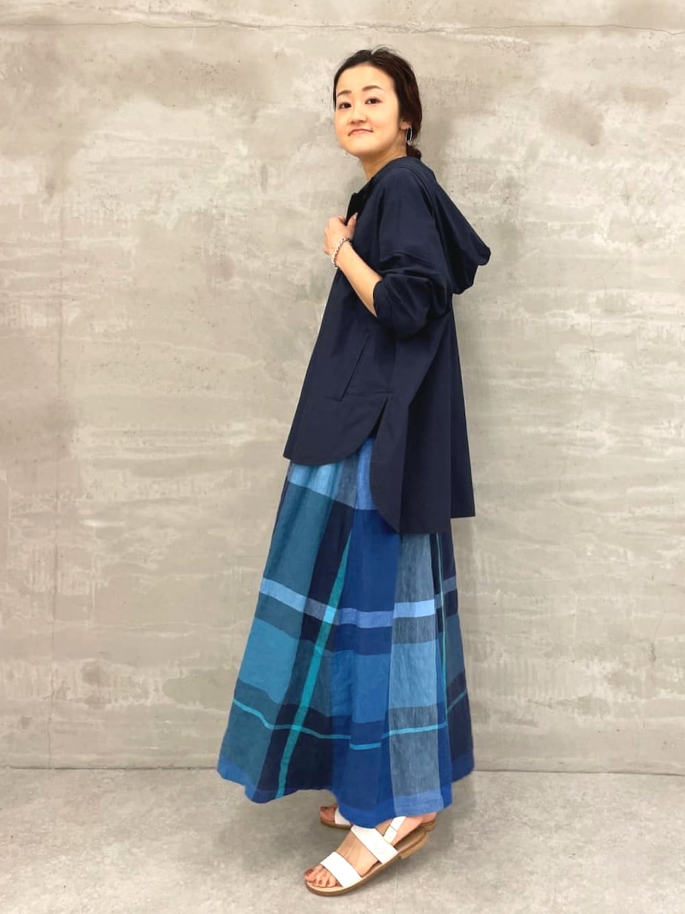【parker】着用サイズ:F 昨年人気で完売が早かったシャツフーディ。 ブラウス感覚で着られて、夏の日除けにもぴったりです。 裾はシャツカットになっていていてバランスが取りやすく、お尻隠れる着丈が安心。 昨年買い逃された方はお早めに。 洗濯 :手洗い可 伸縮性:なし 透け感:ホワイトは多少あり 裏地 :なし 【skirt】着用サイズ:F オリジナル生地のビッグチェックシリーズ。 リネン生地をたっぷり使ったスカートは色々なブルーを使って濃淡があり素敵です。 ウエストは後がゴムで楽に穿けます。 腰骨のあたりで穿いて、くるぶしが見えるくらいの着丈です。 伸縮性:なし 透け感:なし 裏地 :なし 【bag】 sample 【shoes】 FABIO RUSCONI