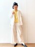 【tops】着用サイズ:F サラサラとした肌触りで軽く着れるカットソー。裾が斜めのカットになっているので、様々なシルエットのボトムでもバランスが取りやすいです。 洗濯 :手洗い可 伸縮性:あり 透け感:白は少しあり 光沢感:なし 【outer】着用サイズ:F 店頭人気アイテム。 パーカーでは珍しいシャツ感覚で着れる羽織もの。白とネイビーの2色展開で、どちらも春らしいコーディネートで楽しめます。 洗濯 :手洗い可 伸縮性:なし 透け感:白は少しあり 裏地 :なし 【bottom】着用サイズ:1 総レースが可愛いウエストリブパンツ。 すっぽりと楽に穿きやすいデザインで足首が少し透けるのもこれからの季節にぴったりです。 洗濯 :手洗い可 伸縮性:なし 透け感:裾の部分はあり 裏地 :あり 【shoes】着用サイズ:38size(24.5~25cm) 柔らかい履き心地のファビオのフラットシューズ。踵にはゴムが入っているのですっぽりと履けるデザインです。