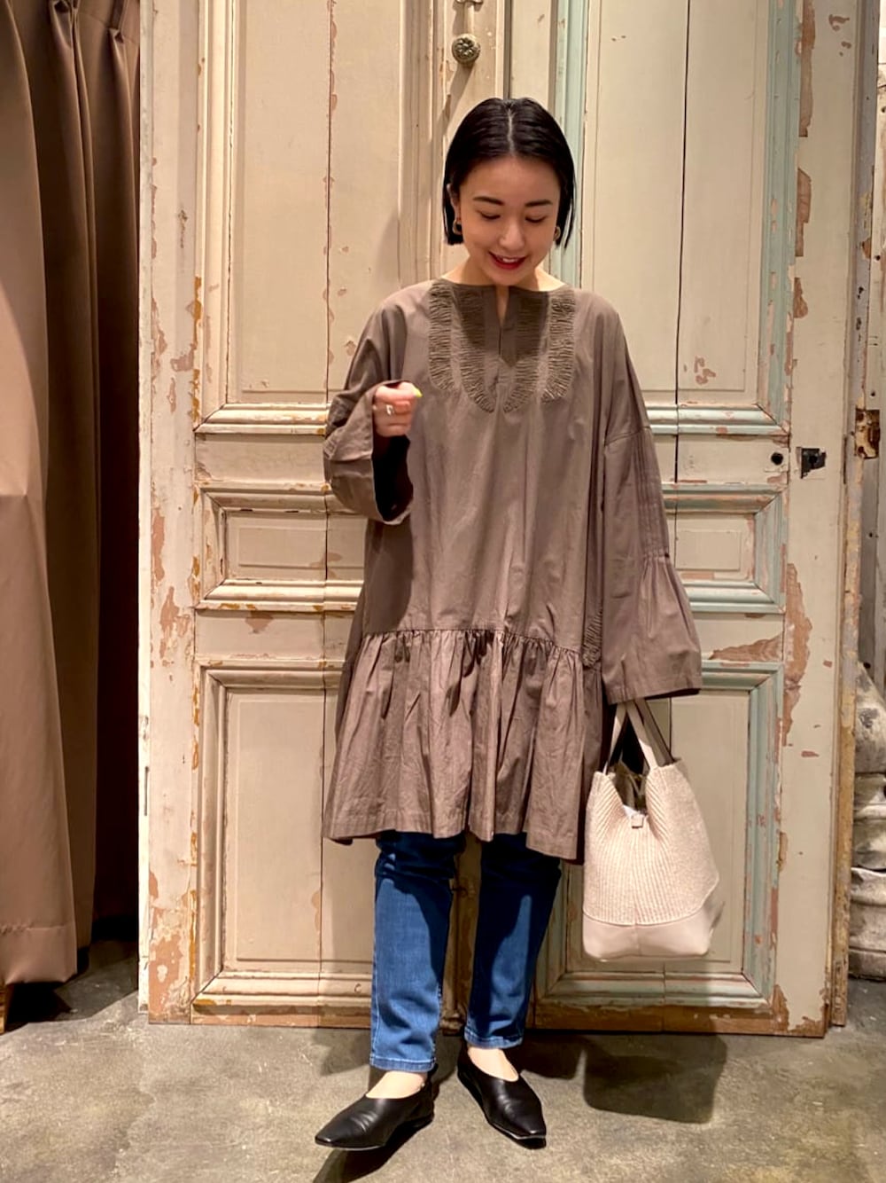 【blouse】着用サイズ:F 襟元の刺繍がアクセントになったチュニックブラウス。 148cmで膝上ぐらいの丈の長さになります。 洗濯:ドライクリーニング 伸縮性:なし 透け感:なし 裏地:なし 光沢感:なし 【pants】着用サイズ:0 ビアズリー定番のパギンスシリーズ。 伸縮性がとてもあり履きやすいです。 洗濯:手洗い可 伸縮性:あり 透け感:なし 裏地:なし 光沢感:なし 【bag】 Del Conte 【shoes】着用サイズ36 (普段22.5~23cm) 2.718