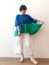 〜 夏が待ち遠しくなるブラウス 〜 【tops】着用サイズ:F 華やかでパッと目が引くブラウス。 しっかりお袖もあり、生地が柔らかく軽いので 夏のベタつく時期もサラリと着用しやすいです。 ブルーとグリーンの色味が清涼感があり、デニムやカーキのパンツにも相性がよいと思います。 伸縮性:なし 透け感:多少あり 裏地 :なし 光沢感:なし 【bottom】着用サイズ:1 裾部分にカーブを描いたコクーンシルエットのデニム。 ややハイウエストにし、腰回りはしっかりカバーしつつ、お直し不要なクロップド丈にし、裾の断ち切りフリンジで軽さを出しています。 サイドウエスト部分にボタンがつき、サイズの調整が可能。 洗濯 :手洗い可 伸縮性:あり 透け感:なし 裏地 :なし 【shoes】着用サイズ:36size(22.5~23cm)