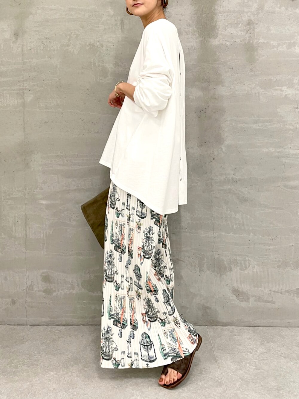 【cutsewn】着用サイズ:F 昨年の春夏に人気ですぐ完売してしまったパールボタンカットソーが入荷予定です。 後ろのパールが上品な印象で、カットソーですが、生地にハリがあるのでブラウス感覚で着ていただけます。 後ろが長めでおしり隠れる着丈。 お袖のタックもポイントになります。 洗濯 :手洗い可 伸縮性:多少あり 透け感:多少あり 裏地 :なし 【cardigan】着用サイズ:0 ヒラヒラロングカーディガンが店頭にも入荷しています。 シーズンの変わり目に使いやすいコットン100%。 深めに入るスリットが、ロングカーディガンを軽やかに見せてくれます。 0サイズ着用で膝上の着丈です。 洗濯 :手洗い可 伸縮性:あり 透け感:なし 裏地 :なし 【pants】着用サイズ:F 地球儀や船など、"旅"をテーマにしたノスタルジックなビアズリーオリジナルプリントが目を惹くパンツ。 ウエストゴムで穿きやすく、シワも気にならないので、実際のご旅行でも穿いていただけたら嬉しいというデザイナーの気持ちもこもっています。 細かいプリーツなので広がりも気にならず、柄の印象も強すぎません。 私の身長でくるぶしくらいの着丈です。 伸縮性:なし(ウエストはゴムなのであり) 透け感:なし 裏地 :あり 【shoes】 FABIORUSCONIのレザーサンダルが今年も入荷予定です。 こちらのサンダルはホワイトとシルバーの2色展開予定です。