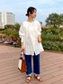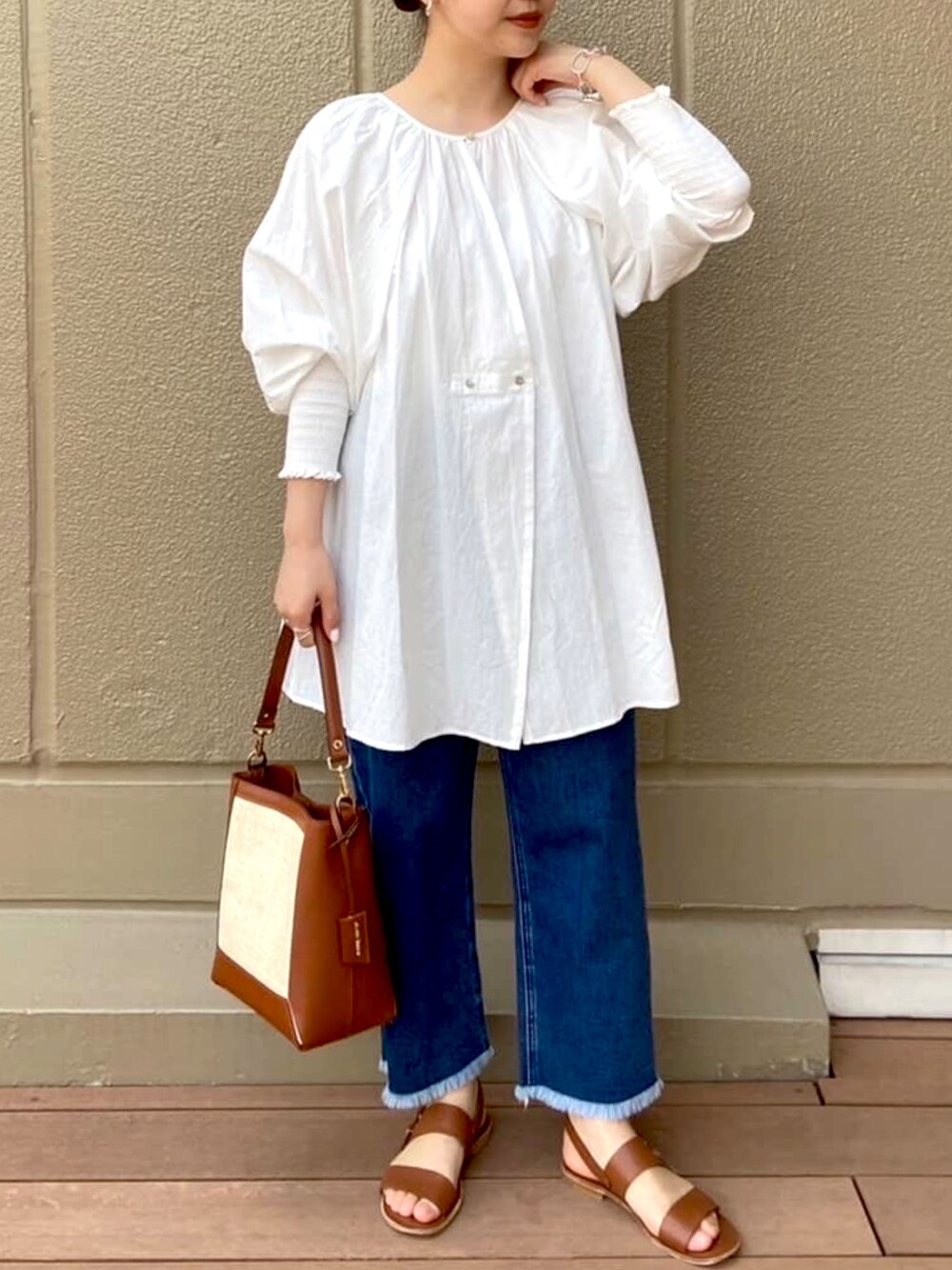 【blouse】着用サイズ:F 袖がシャーリングになっていて女性らしいデザインのブラウス。 肩周りのパフがポイントに◎ 透け感はありますが、インナーにカラー物のキャミソールやハイネックなど合わせるのもおすすめです! 洗濯 :手洗い可 伸縮性:袖口のみあり 透け感:あり 裏地 :なし 光沢感:なし 【bottom】着用サイズ:F 裾がフリンジのようになっているカジュアルなデニム。 サイズはフリーサイズですが、多少ストレッチも効いているので穿きやすいです◎ シルエットはストレート。 着丈は短めなので春夏の暖かい時期はサンダルと合わせるとスッキリ! 洗濯 :手洗い可 伸縮性:多少あり 透け感:なし 裏地 :なし 光沢感:なし 【bag】 GIANNI NATARO CAROL J 【shoes】 スタッフ私物