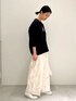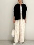 【outer】着用サイズ:1 お袖がニットになったブルゾン。 軽めのアウターなので、カーディガン代わりにも使いやすいアイテムです。 163cmで1サイズを着るとおしりが半分隠れるぐらいの着丈になります。 洗濯 :ドライクリーニング推奨 伸縮性:袖部分のみあり 透け感:なし 裏地 :あり 光沢感:あり 【tops】着用サイズ:F 柔らかなコットンを使用したコナユキシリーズ。 カットソーより薄手の生地になるので、インナーとして使うのがオススメです。 洗濯 :手洗い可 伸縮性:あり 透け感:インナーを着ると気になりません 裏地 :なし 光沢感:なし 【bottom】着用サイズ:F ロープ柄がプリントされたワイドパンツ。 股上が深いデザインなので、ハイウエストで履いていただくと脚長効果もあります。 ウエストはぴったりとした履き心地で、着丈は163cmでくるぶしにかかるぐらいです。 洗濯 :手洗い可 伸縮性:なし 透け感:なし 裏地 :なし 光沢感:なし 【bag】 Del conteのメッシュバッグ。 持ち手を片側に寄せてショルダーバッグとしてもお使いいただけます。 【sample】pierce,shoes