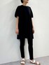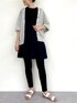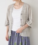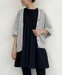 【cutsewn】着用サイズ:F 胸下あたりで生地を切り替えたギャザーチュニック。 切り替え上はカットソー生地で伸縮があり、切り替え下とお袖は布帛生地で軽やかな印象になっています。 パフスリーブまでいかない、ふんわりと丸みのあるお袖が女性らしく1枚でコーディネートが決まります。 ブラックはちょっとしたお出かけやお子様の保護者会などにも着ていける1枚です。 伸縮性:切り替え上はあり 透け感:なし 裏地 :なし 【cardigan】着用サイズ:F 柔らかいリネン素材が肌あたり優しいカーディガン。 今年はドルマンスリーブでお袖がリブになったデザインです。 夏の冷房避けや日除けにぴったりの1枚です。 伸縮性:あり 透け感:多少あり 裏地 :なし 【pants】 コットンパギンス。 ウエストもゴムで、生地にもストレッチがきいていてとても穿きやすい。 ブラックは万能に使いやすいです。 洗濯 :手洗い可 伸縮性:あり 透け感:なし 裏地 :なし