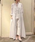 【one-piece】着用サイズ:F ウエスト部分にギャザーを寄せた シャツワンピース ホワイト×ライトブルーの ストライプをいれた春らしいデザイン 前開きなので羽織としても使える 着回しのきくワンピースです 洗濯 :手洗い可 伸縮性:なし 透け感:インナーを着れば気になりません 裏地 :なし 【inner】着用サイズ:F ヘンプ素材を使用した パリッとハリのあるリネンタンクトップ サラッとした肌離れしやすい素材なので 暑い時期にも着やすいインナーです 洗濯 :手洗い可 伸縮性:なし 透け感:多少あり 裏地 :なし 【bottom】着用サイズ:0 コクーンシルエットのデニムパンツ 少しハイウエストなので 腰回りはしっかりカバーしてくれます 春夏に着やすいクロップド丈 裾を断ち切りフリンジにし 足元をスッキリ見せてくれます ウエスト部分にのサイドには ボタンが付いてるので サイズの調整もできます 洗濯 :手洗い可 伸縮性:あり 透け感:なし 裏地 :なし