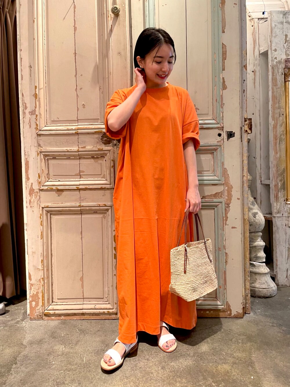 【one-piece】着用サイズ:F 一枚でラフに着れるTシャツワンピ。 後ろはスリットが入っているので動きやすいです。 148cmで足首が隠れる長さです。 洗濯:手洗い可 伸縮性:あり 透け感:なし 裏地:なし 光沢感:なし 【bag】 Sans Arcidet 【shoes】着用サイズ36 (普段22.5~23cm) FABIORUSCONI