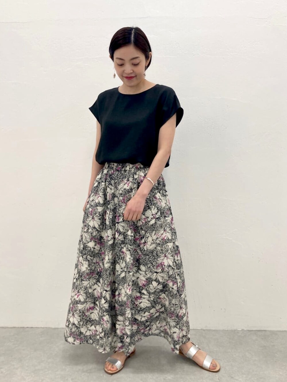 【トップス】着用サイズ:F ラフに軽く着用できるTシャツのようなイメージのブラウスです。 合成繊維を使用しているので、シワやお手入れが気にならないのが嬉しいです。 【パンツ】着用サイズ:F 風の抜けるフレアシルエットで暑い時期にも着られるワイドパンツです。 ヴィンテージの花柄に、ロゴの様な幾何柄を合わせて、甘過ぎないプリントです。